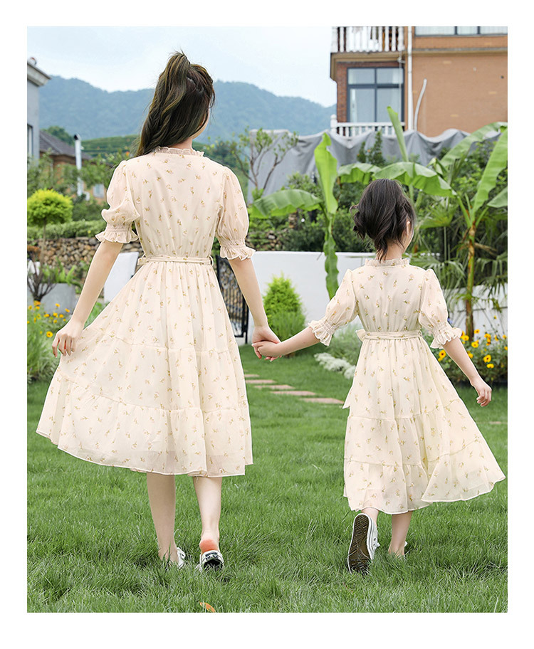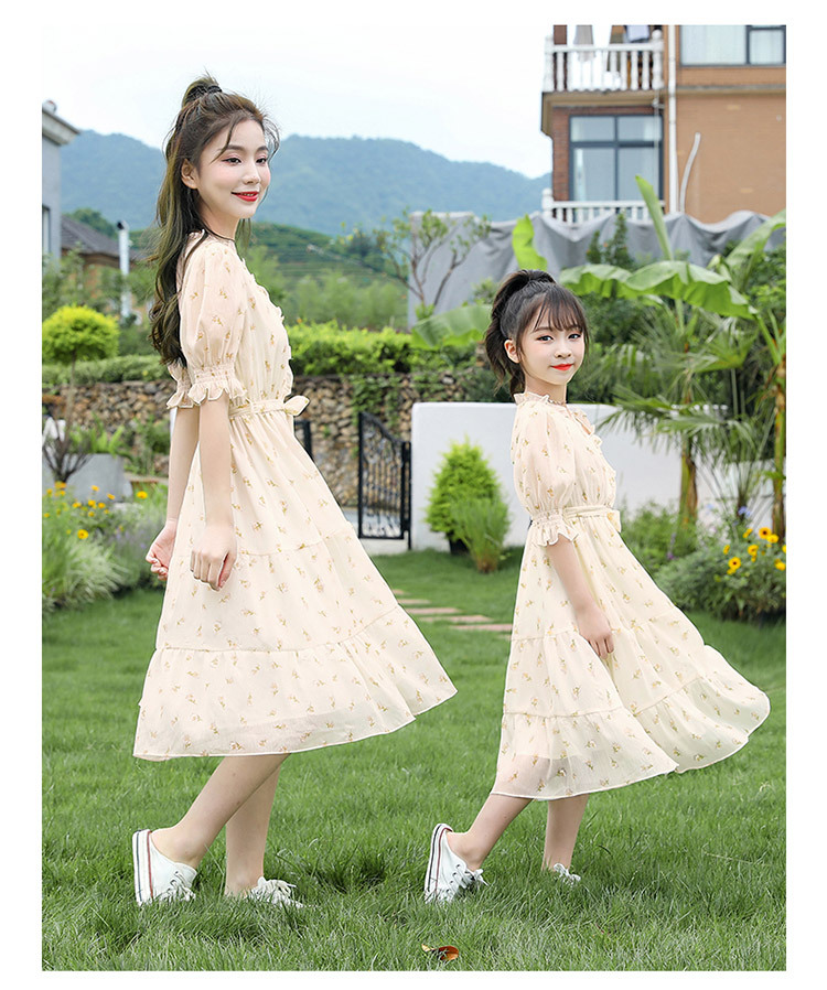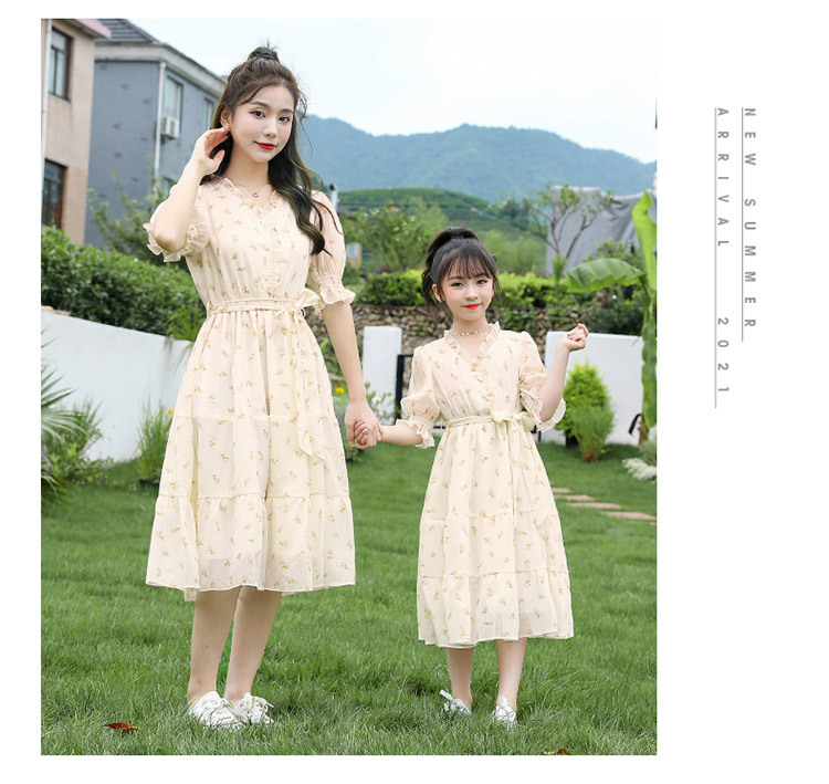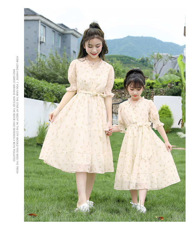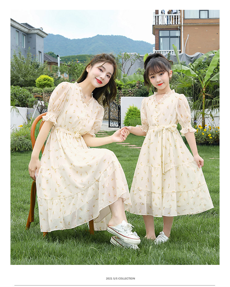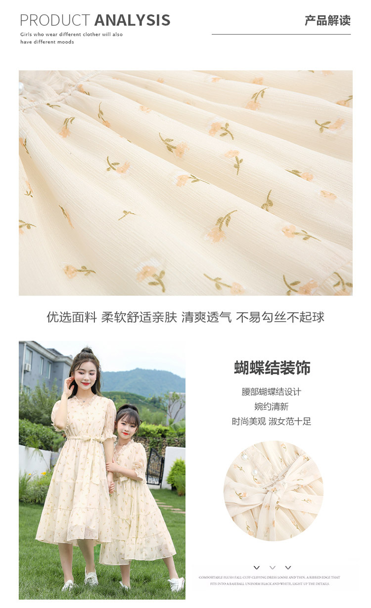 어린이 보헤미안 긴 살구색 꽃 원피스 어머니-딸 부모-자식 세트 어머니 딸 레이스 칼라 쉬폰 얇은 스커트스토어 가기