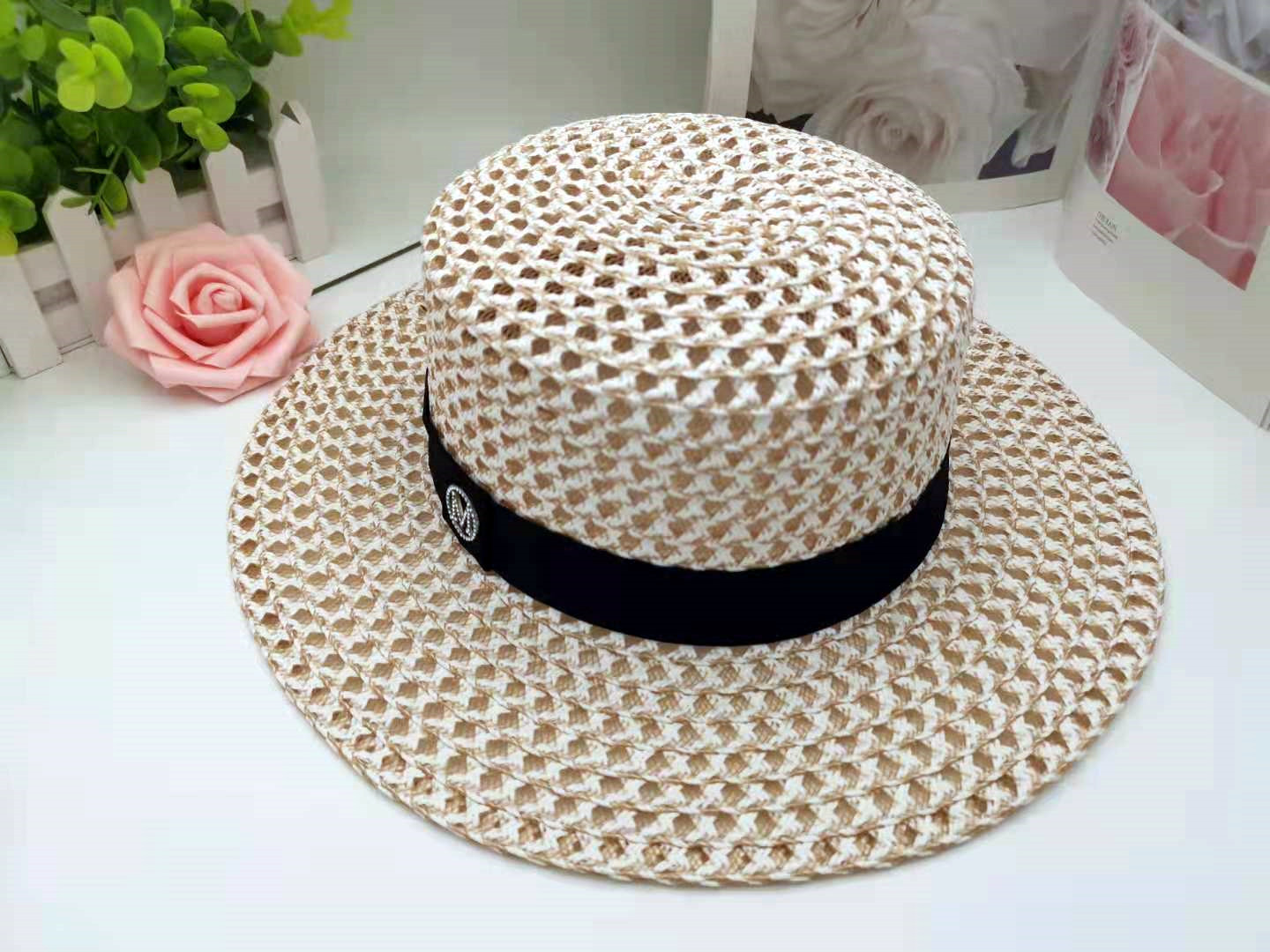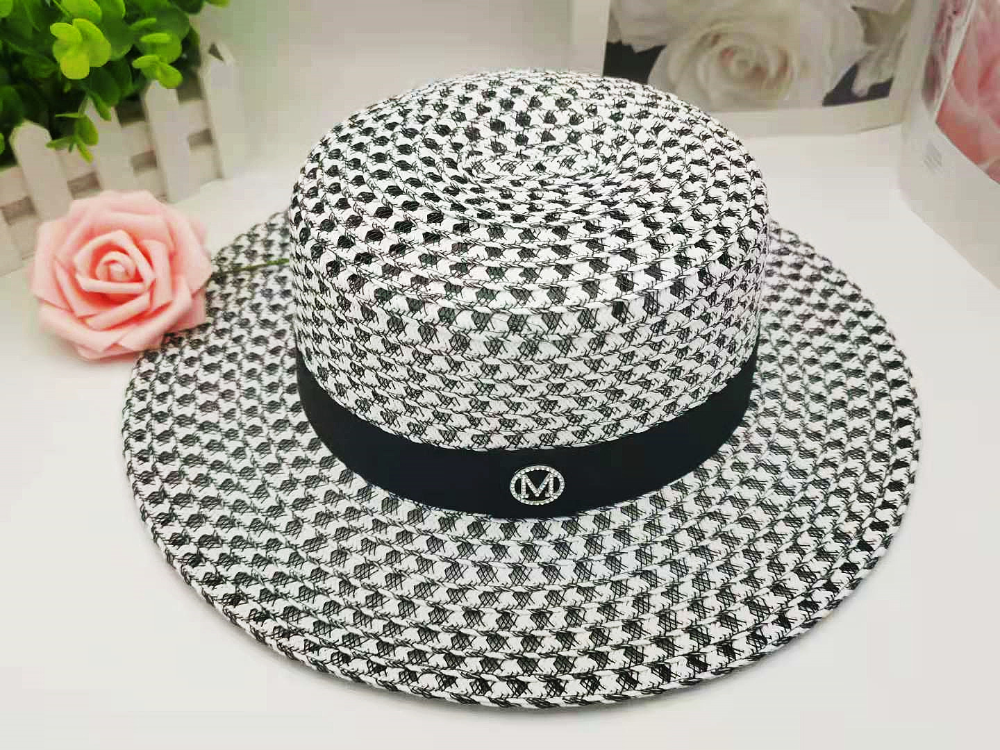 한국 스타일 트렌디 그리드 플랫 탑 모자 여성 패션 M 로고 흑백 짠 밀짚 모자 여름 새로운 인터넷 연예인 차양 탑 모자스토어 가기