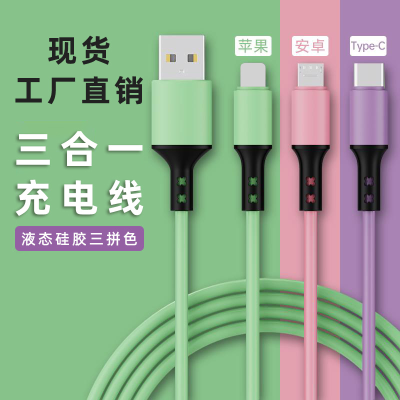 液态硅胶一拖三快充数据线 适用苹果安卓type-c手机三合一充电线