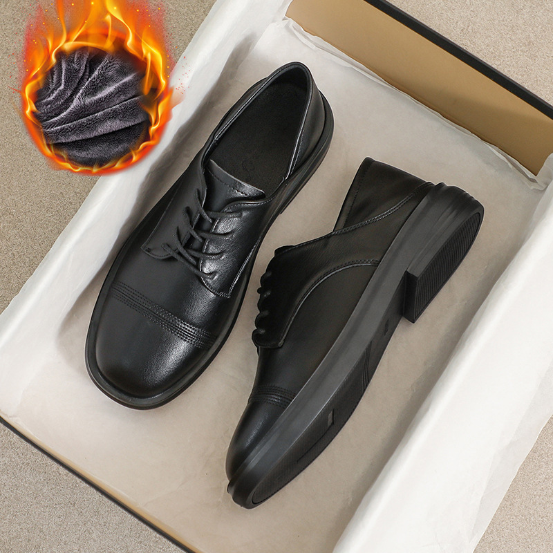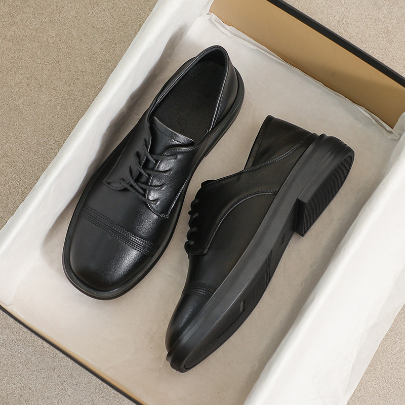 여성을위한 정품 가죽 작은 가죽 신발 2025 새로운 가을 얇은 플랫 작업 검은 영국 스타일 두꺼운 밑창 싱글 신발스토어 가기