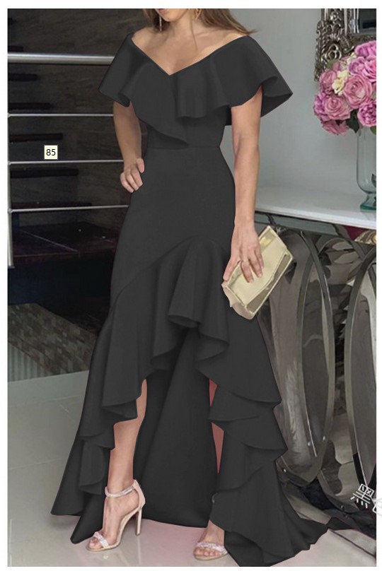 유럽과 미국의 여신 기질 섹시한 V-목 불규칙한 단색 헴 주름진 성격 디자인 여성 원피스