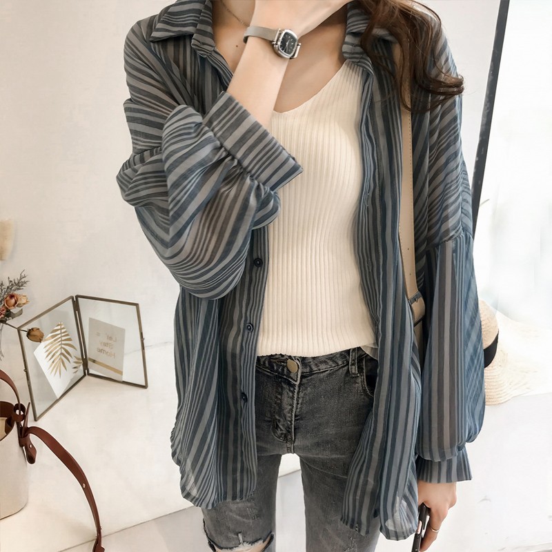 2681 # 한국어 버전 느슨한 랜턴 슬리브 스트라이프 셔츠 여성 쉬폰 카디건 선 스크린 재킷 조수 #스토어 가기