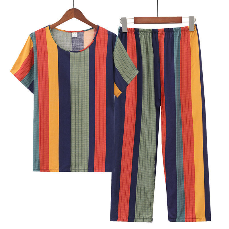 면 실크 잠옷 여자의 여름 면 실크 반팔 세트 중년 어머니 캐주얼 느슨한 면 실크 가정 의류 여자의 겉옷