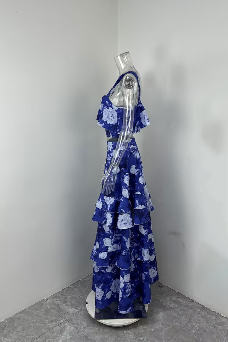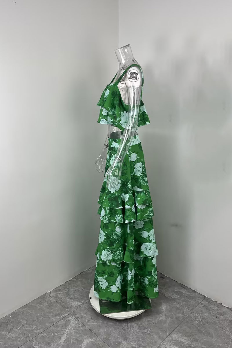 2026년 신상 유럽 및 미국 여성복 해변 휴가 스타일 프린트 투피스 세트, 홀터넥 탑과 케이크 스커트 롱 스커트 세트