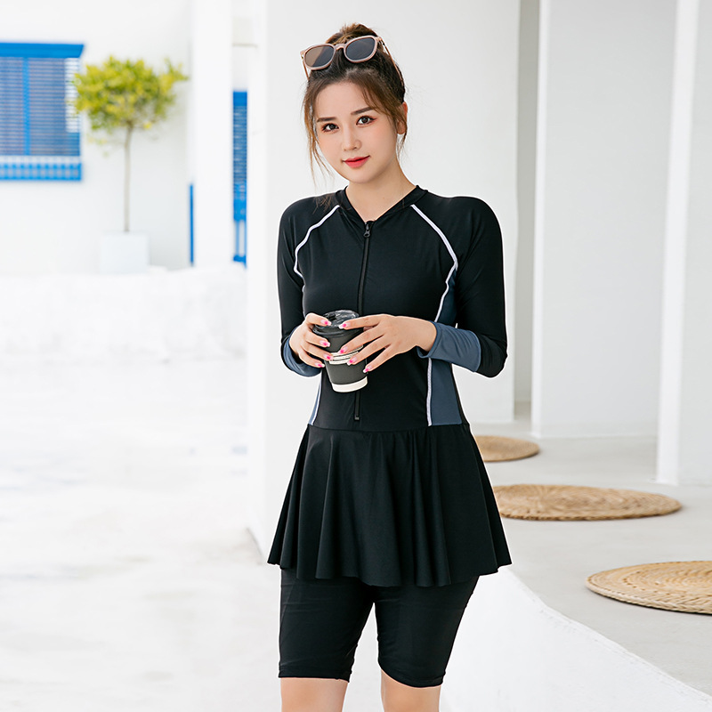 새로운 플러스 사이즈 수영복 여성용 보수적 인 스커트 원피스 스커트 긴팔 슬림 배꼽 덮음 여성용 온천 스포츠 다이빙 슈트스토어 가기