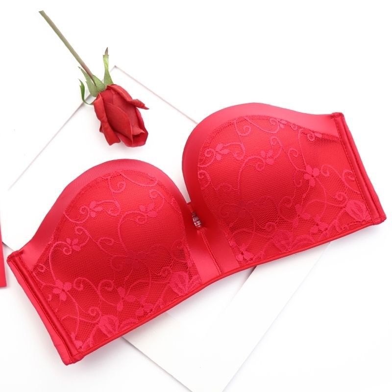 기적의 2 세대 섹시한 레이스 끈이없는 속옷 여성용 미끄럼 방지 작은 가슴 두꺼운 푸시 업 보이지 않는 오프 숄더 빨간 브래지어