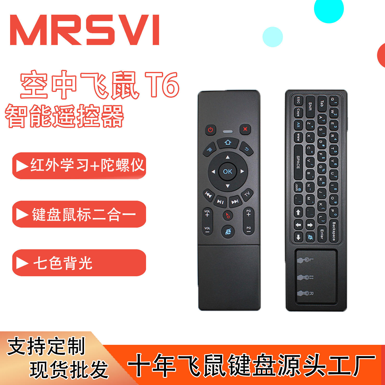 터치 패드가있는 공기 날으는 다람쥐의 T6 7 색 백라이트 버전 7 색 백라이트 6 축 미니 키보드 리모콘