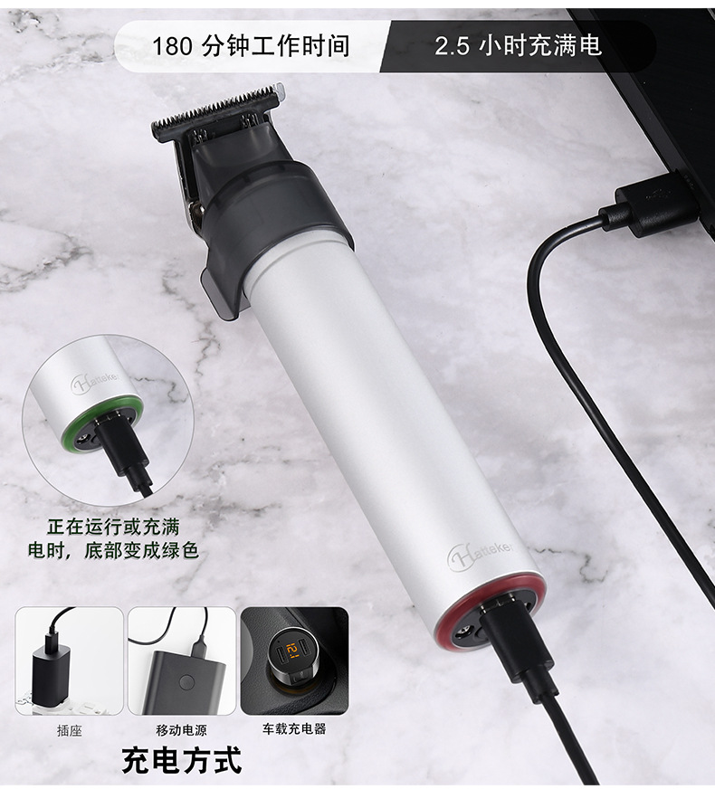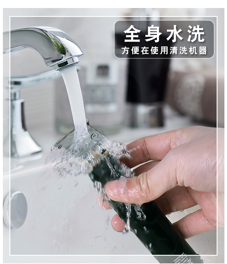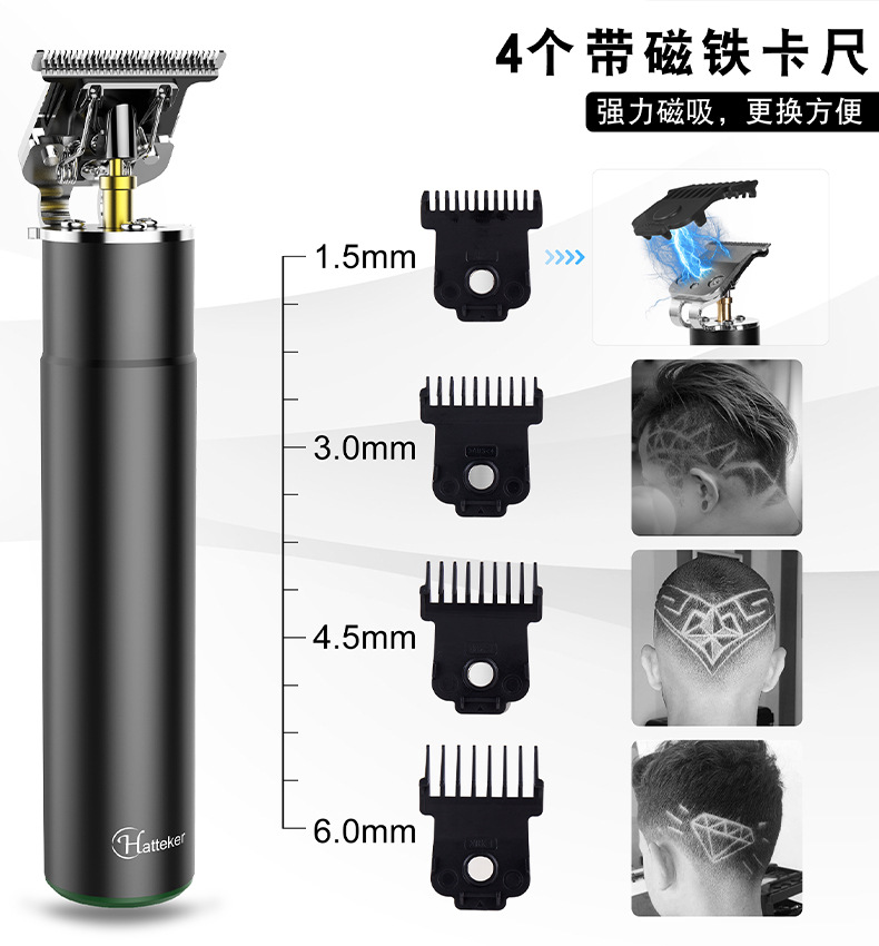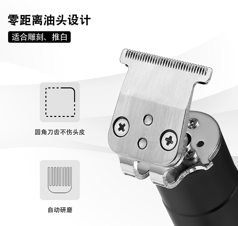 产品详情: 迷你机身、复古油头、渐变造型、环保锂电池、零刀头光头机、磁吸限位梳设计拆装方便、强劲动力、顺滑贴面、安全舒适、IPX6级全身水洗干湿两用、type-c快充接口、全球通用电压。