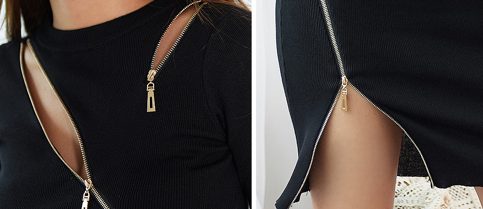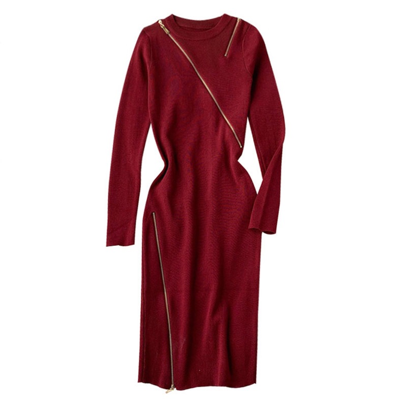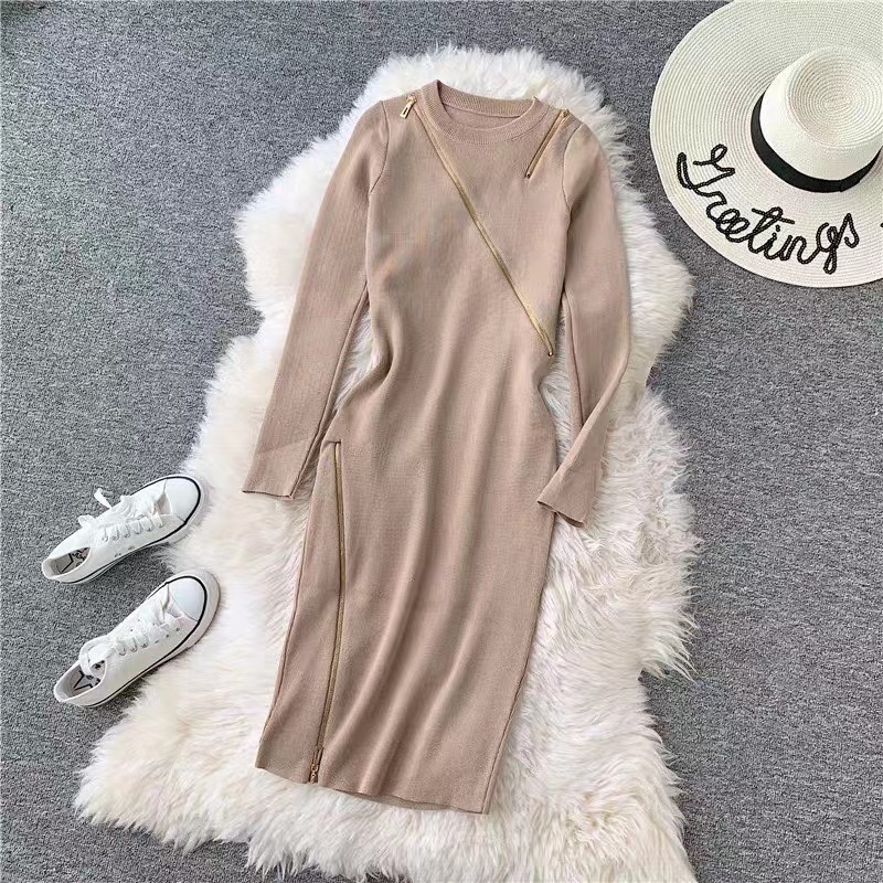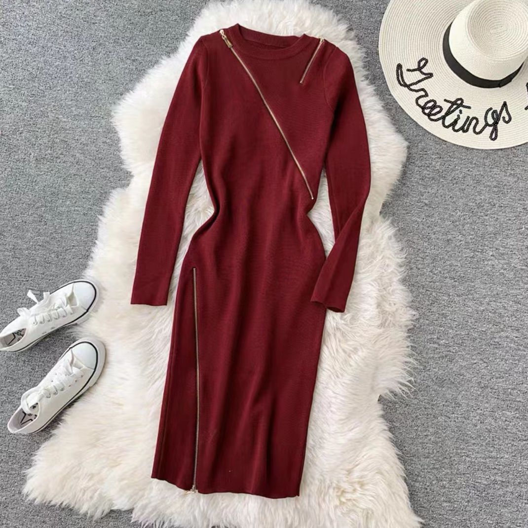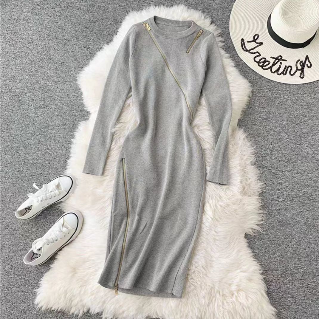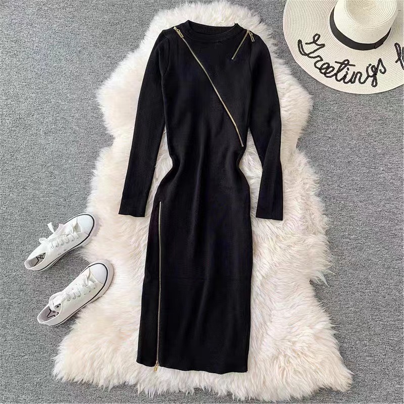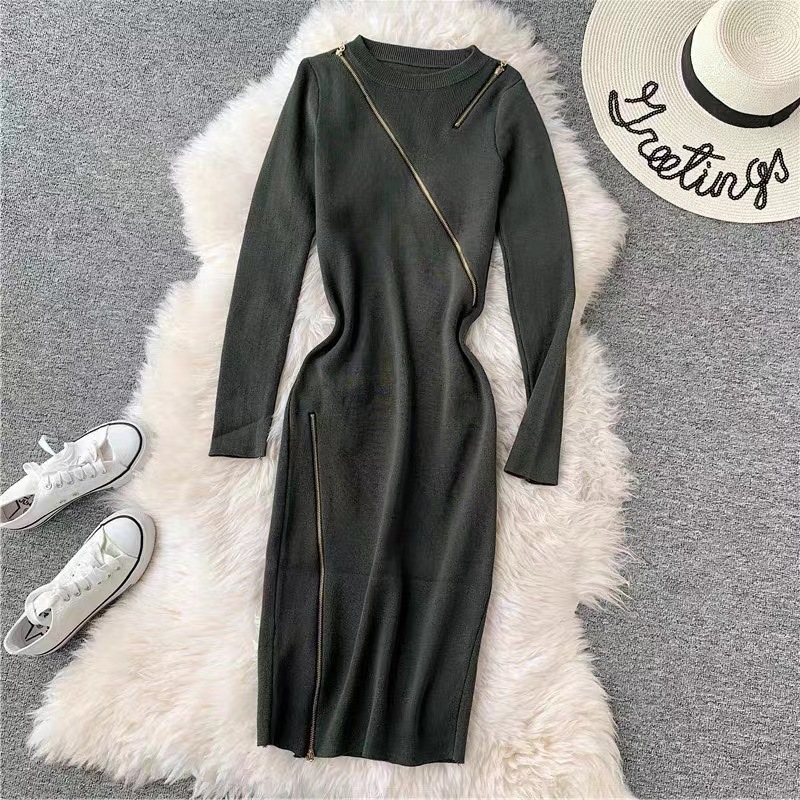 2026 봄, 가을, 겨울 한국 스타일 여성용 슬림핏 스웨터 드레스 사선 지퍼 하프 터틀넥 힙 커버 니트 원피스 6146