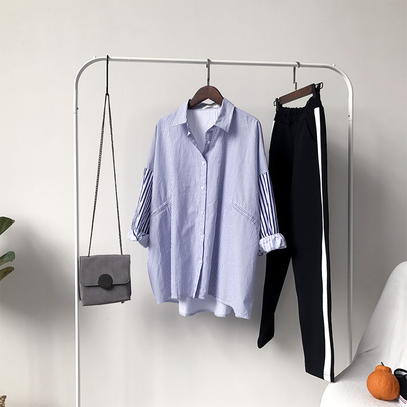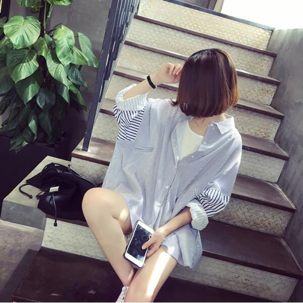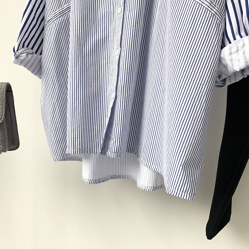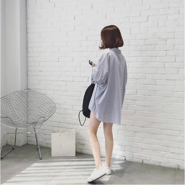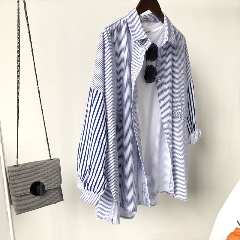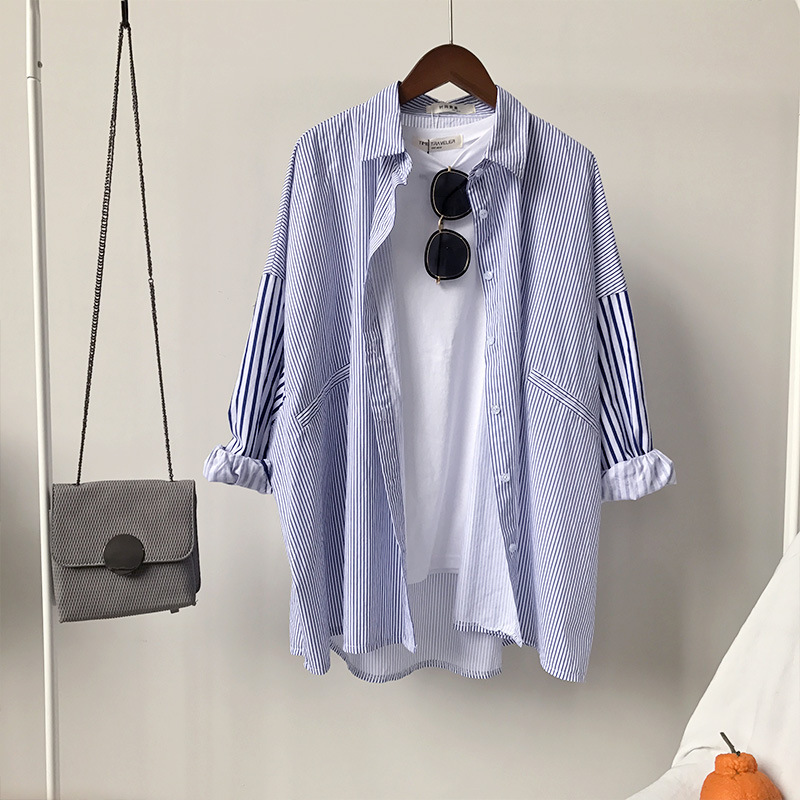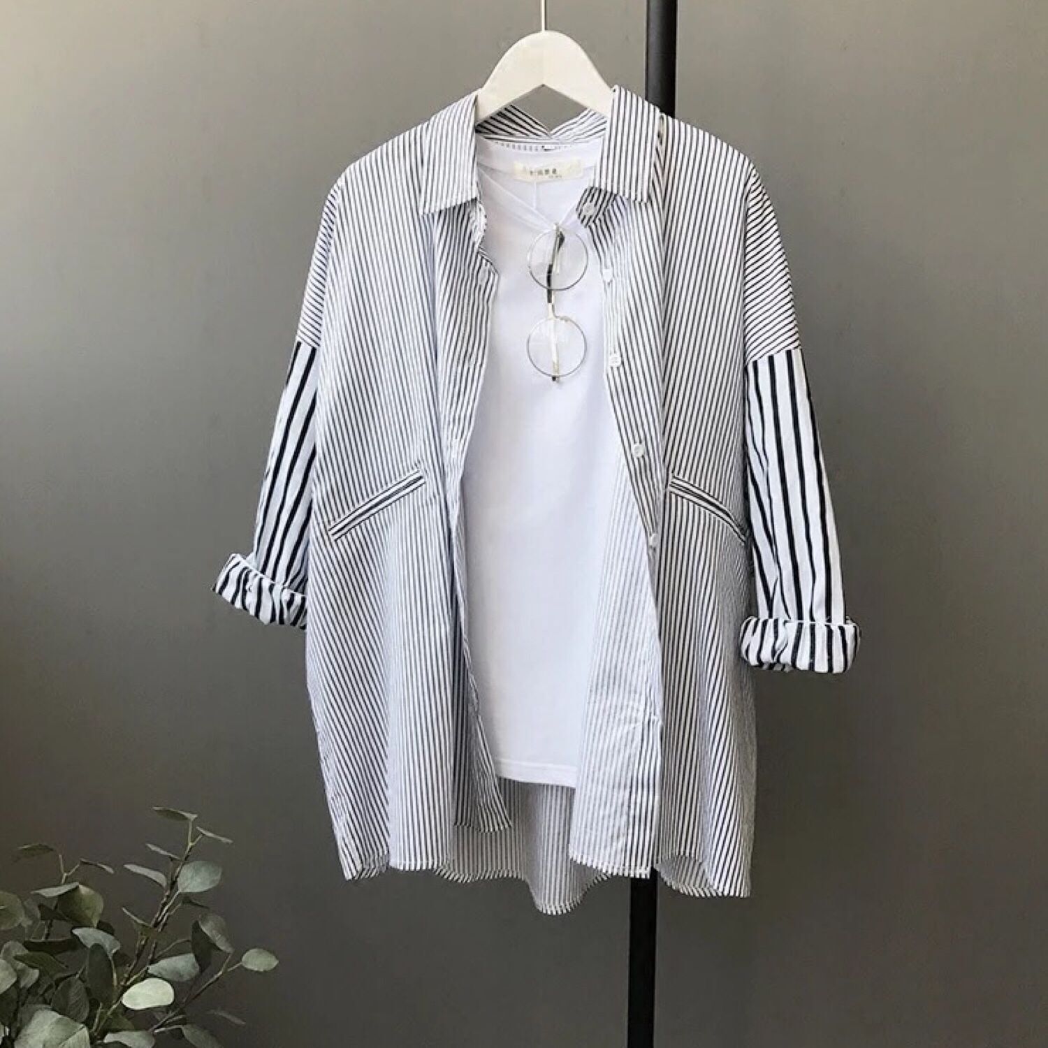 봄 스트라이프 셔츠 여성용 중간 길이 긴팔 플러스 사이즈 학생 모든 매치 느슨한 한국 스타일 남자 친구 스타일 코트 마을 옷스토어 가기