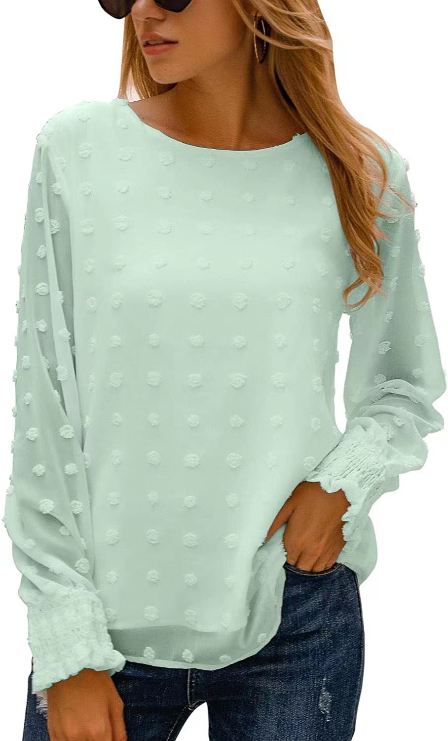 아마존 크로스 보더 새로운 라운드 넥 자카드 쉬폰 셔츠 느슨한 우아한 통근 여성의 유럽과 미국 가을 긴 소매 탑