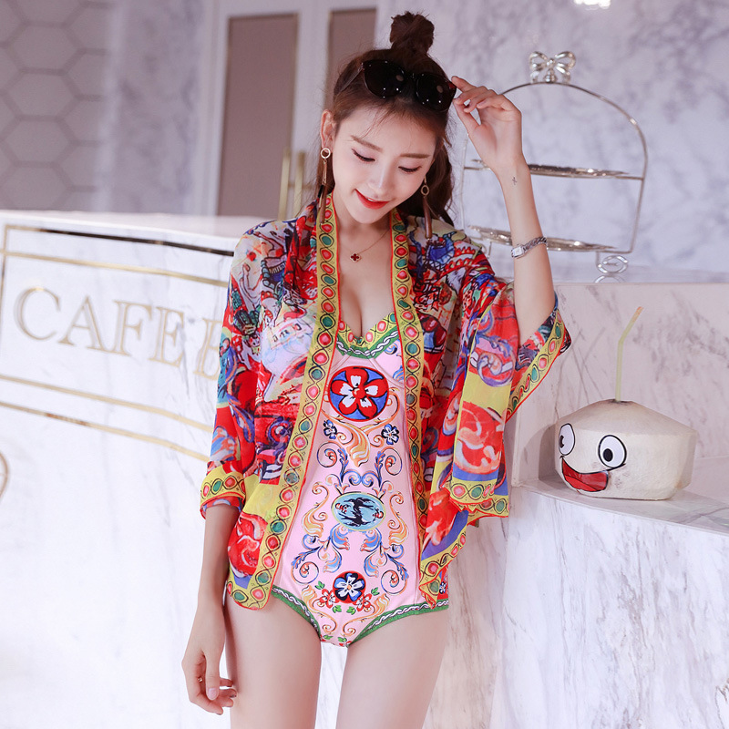 复古风韩国新款三角连体ins风泳衣女钢托小胸聚拢性感显瘦大披纱