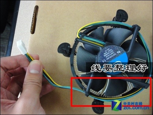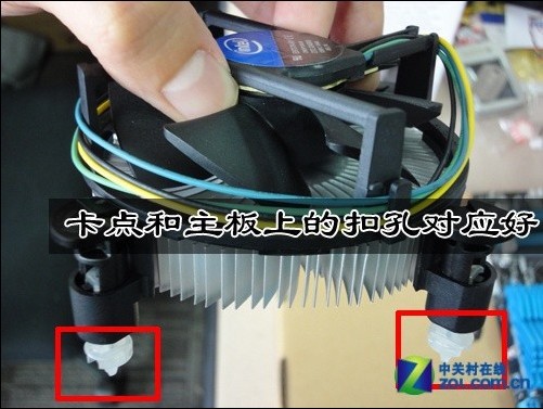 将散热器调放到合适的位置,将风扇水平放置到处理器口盖上方,扣具四周的扣柱(尖嘴触角)的底部需与主板上的四个扣点对齐。