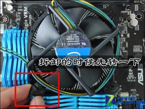 拆卸散热器首先需要拆卸电源线,将风扇电源线与主板分开,然后再处理散热器扣具的拆卸。