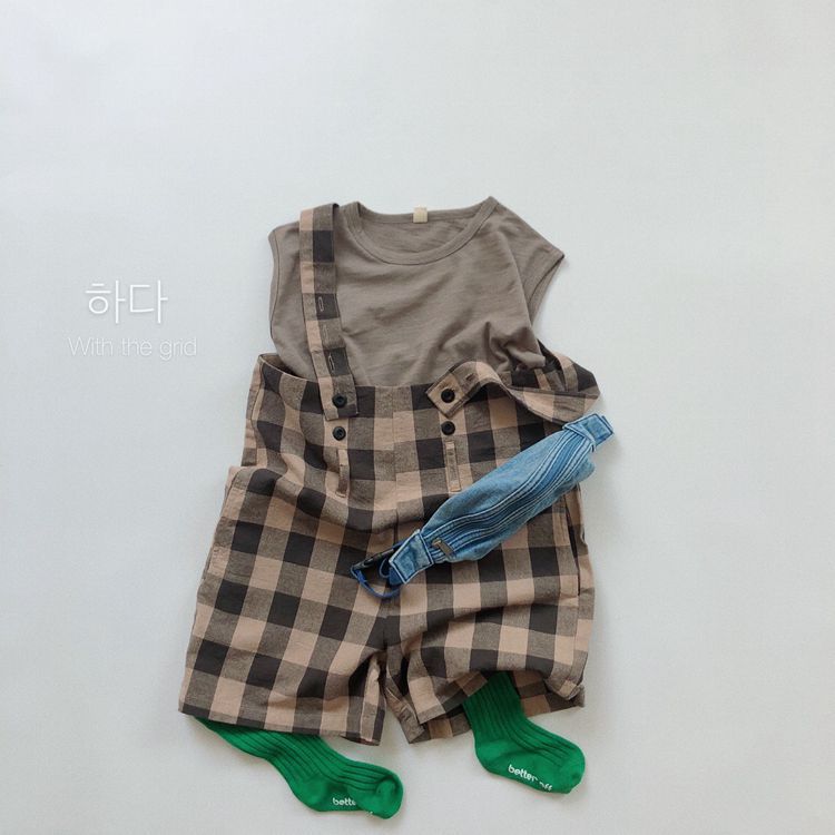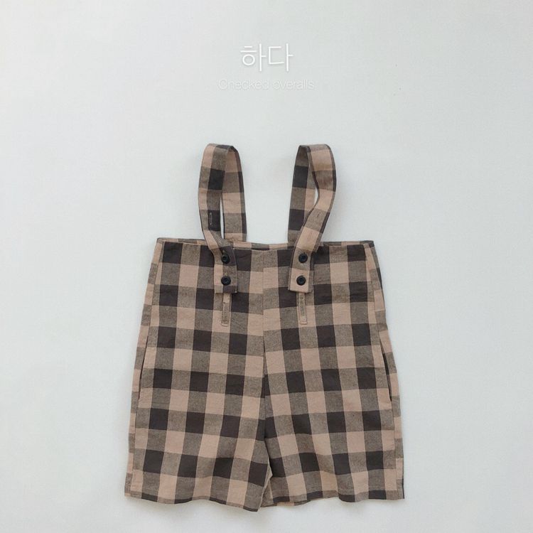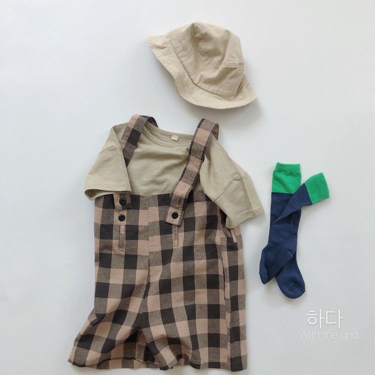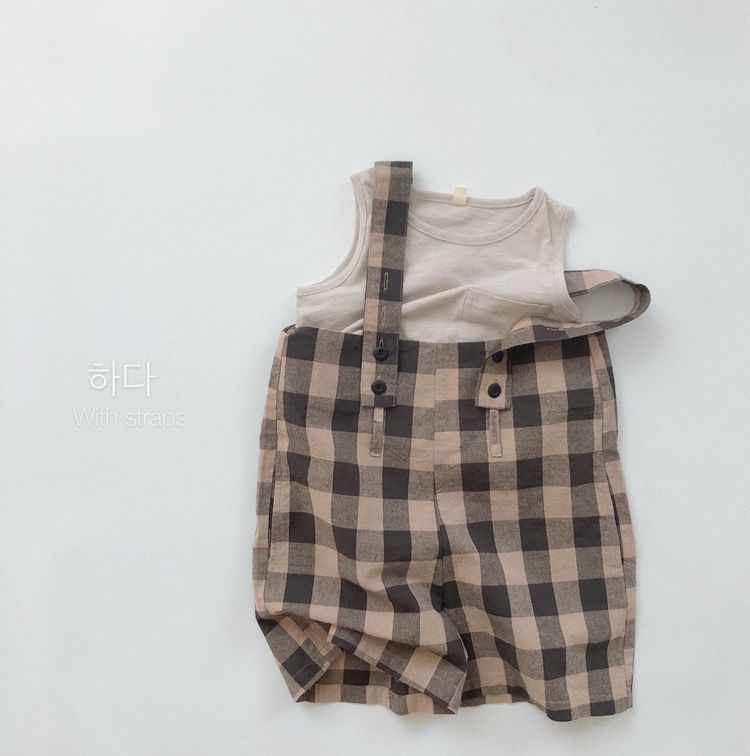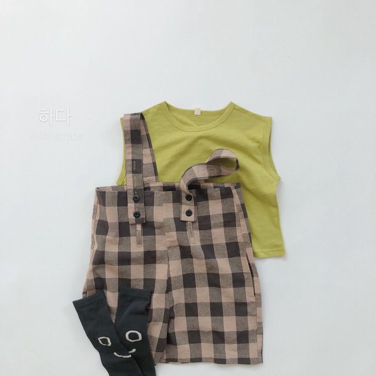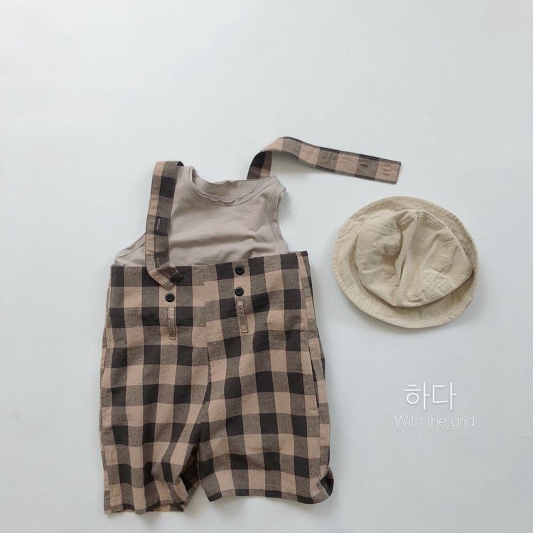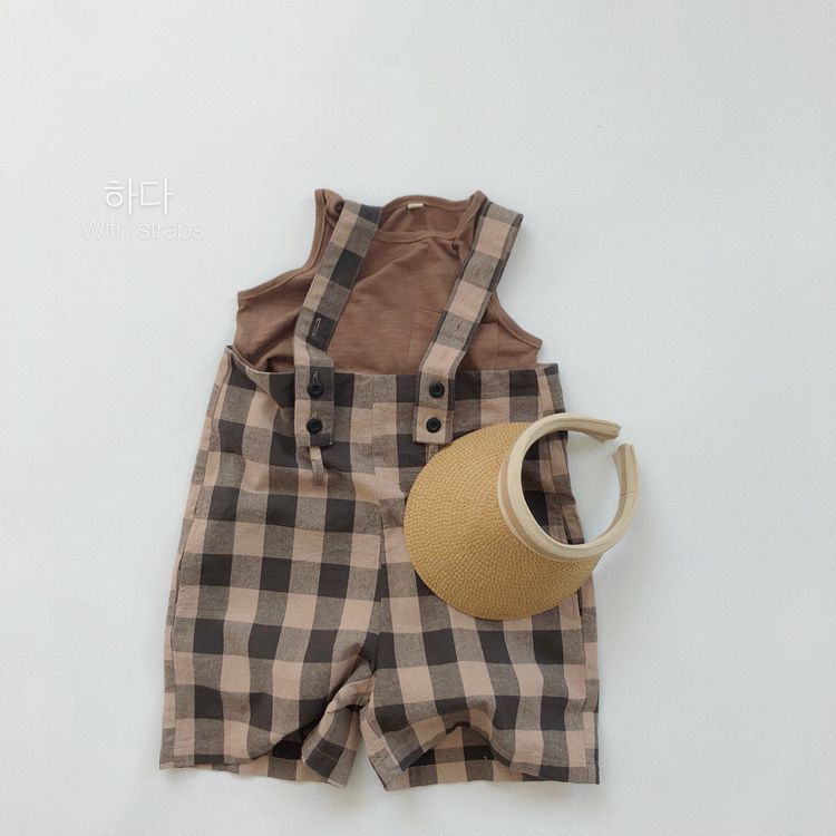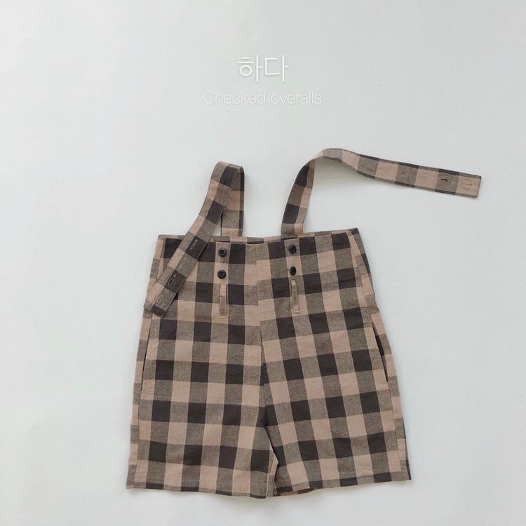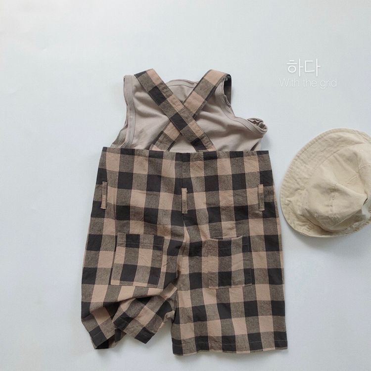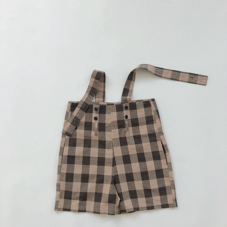 한국 스타일 어린이 멜빵 바지 여름 얇은 멜빵 바지 소년 소녀 면 및 린넨 격자 무늬 원피스 바지 레트로 웨스턴 스타일스토어 가기