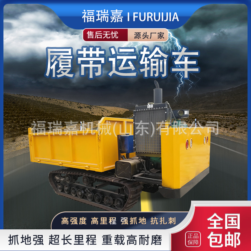 履带运输车是由主动轮驱动、围绕着主动轮、负重轮、诱导轮和托带轮的柔性链环。履带由履带板和履带销等组成。履带销将各履带板连接起来构成履带链环。履带板的两端有孔,与主动轮啮合,中部有诱导齿,用来规正履带,并防止车辆转向或侧倾行驶时履带脱落,在与地面接触的一面有加强防滑筋(简称花纹),以提高履带板的坚固性和履带与地面的附着力。