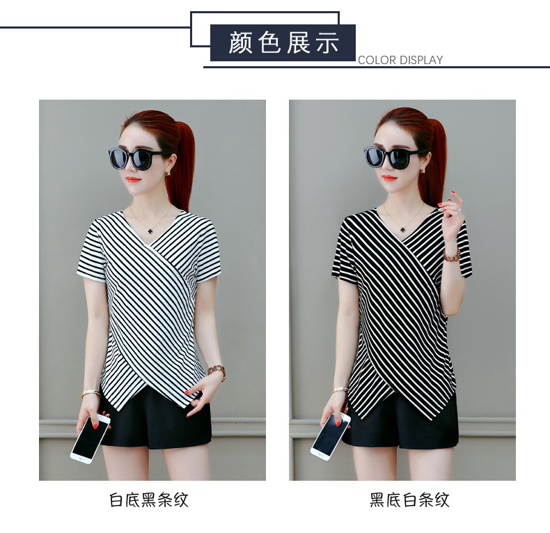 반팔 스트라이프 티셔츠 여성용 여름 새로운 슬림핏 슬리밍 브이넥 탑 유행 스티치 반팔 베이스 셔츠 여성용 트렌디스토어 가기