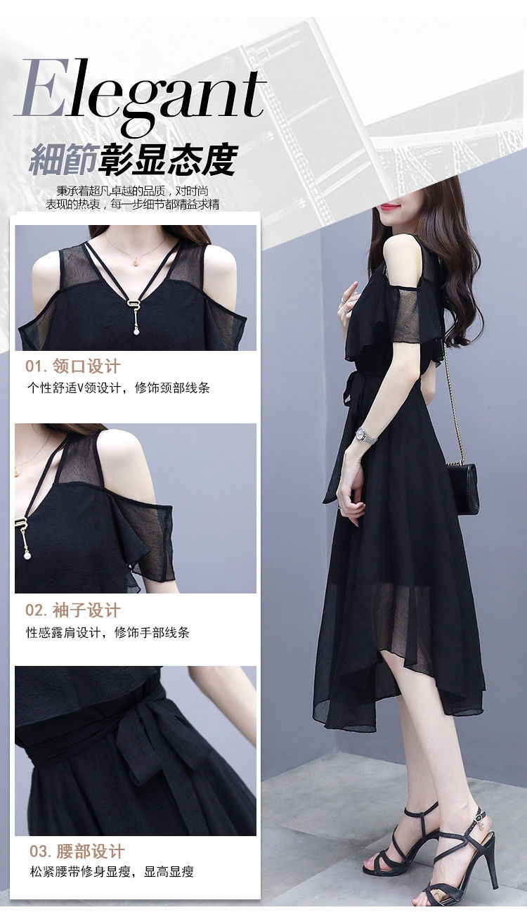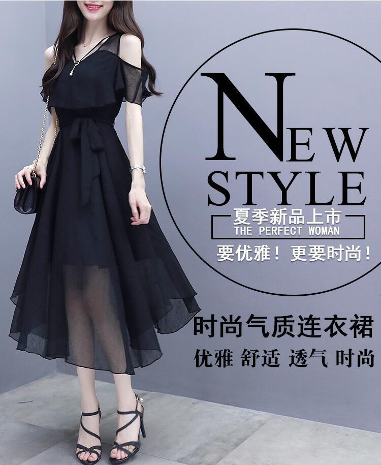 2025 여름 여성의 새로운 드레스 여성 짧은 소매 불규칙한 검은 색 슬림 중간 길이 스커트스토어 가기