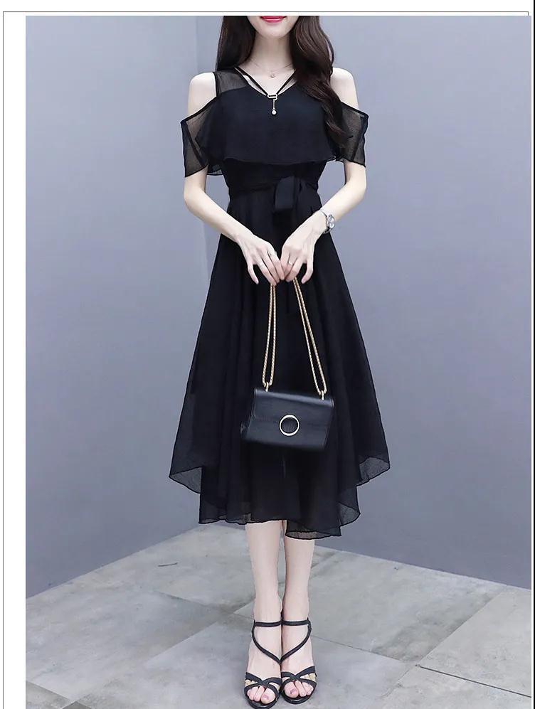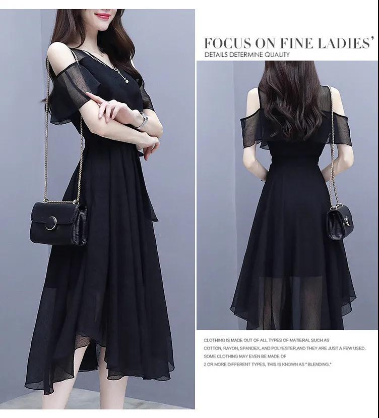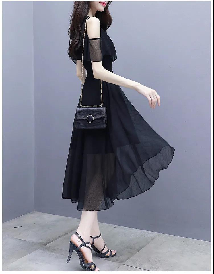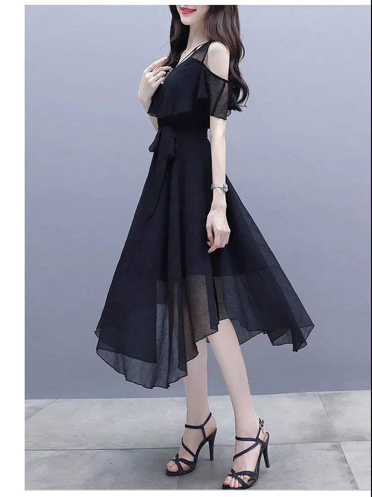 2025 여름 여성의 새로운 드레스 여성 짧은 소매 불규칙한 검은 색 슬림 중간 길이 스커트