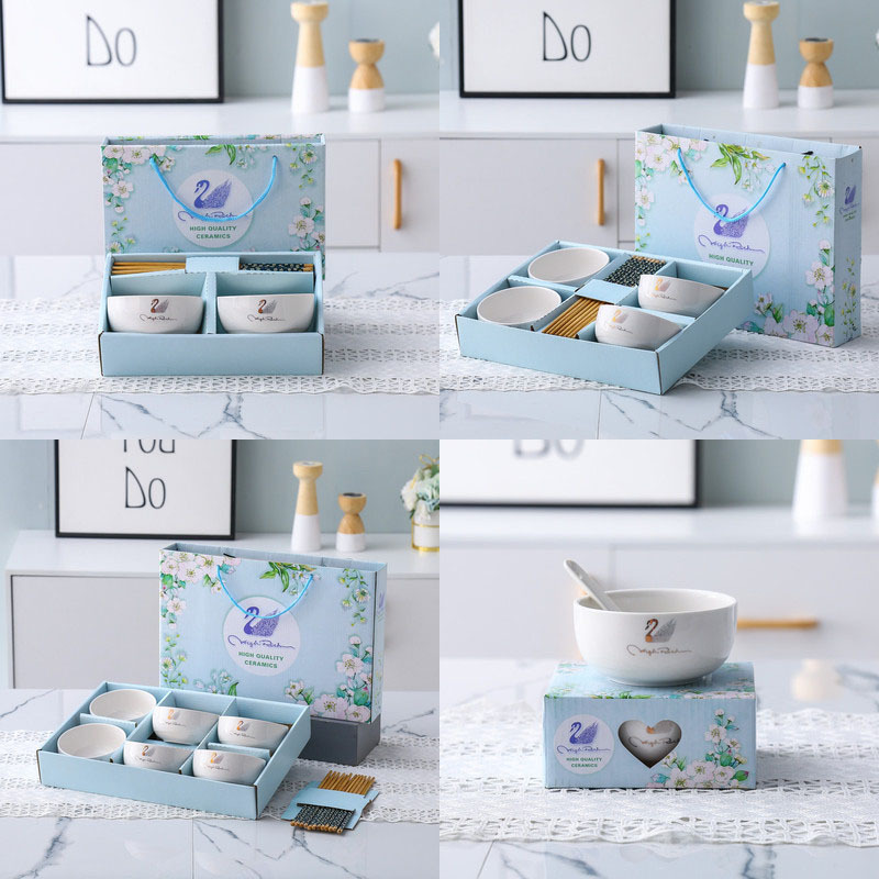 일본식 그릇 젓가락 세트 파란색과 흰색 도자기 그릇 세트 창조적 인 선물 그릇 도자기 식기 선물 상자 활동 선물 로고