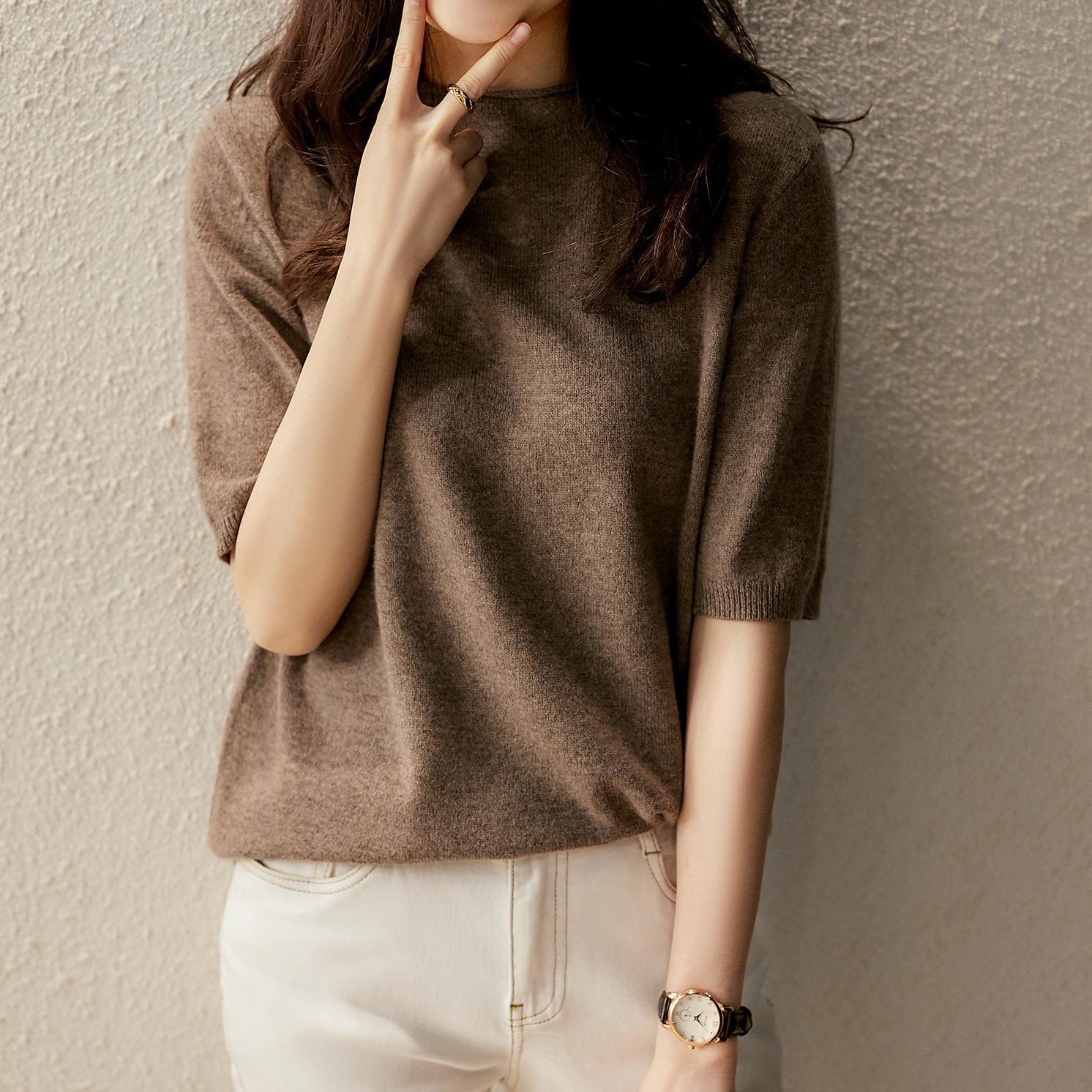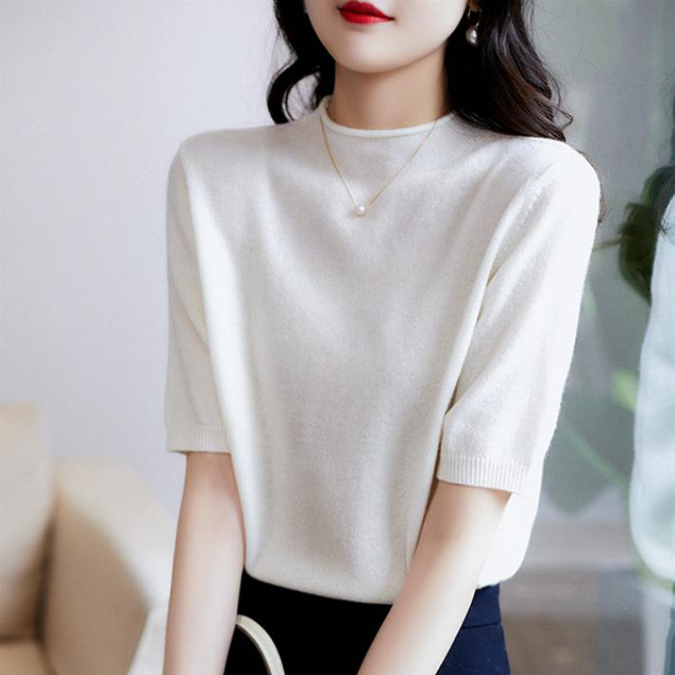 여성용 2022 봄 신작 세미 하이 크루넥 반팔 티셔츠 니트 셔츠 슬림핏 반팔 베이스 씬 탑스토어 가기