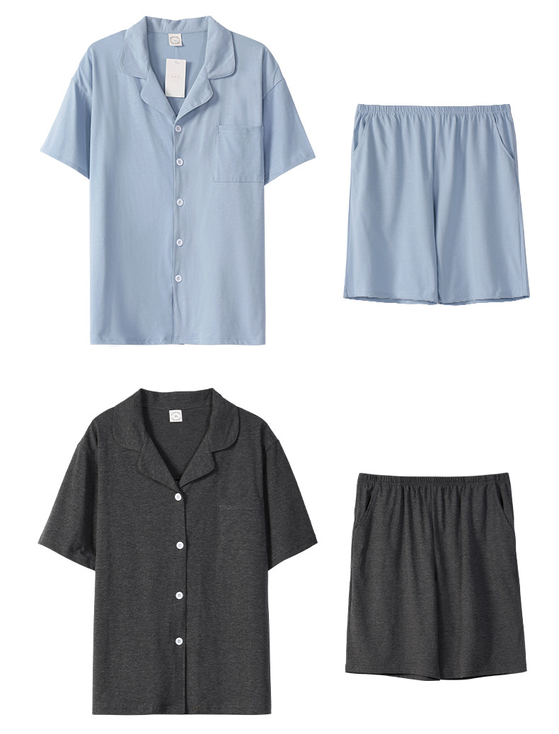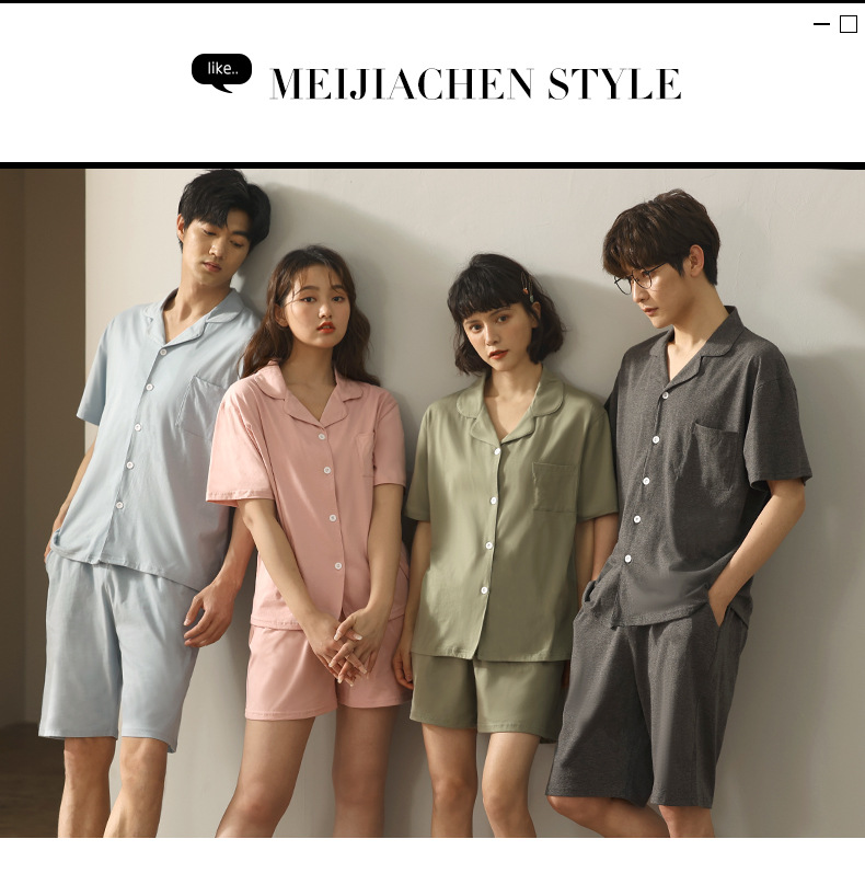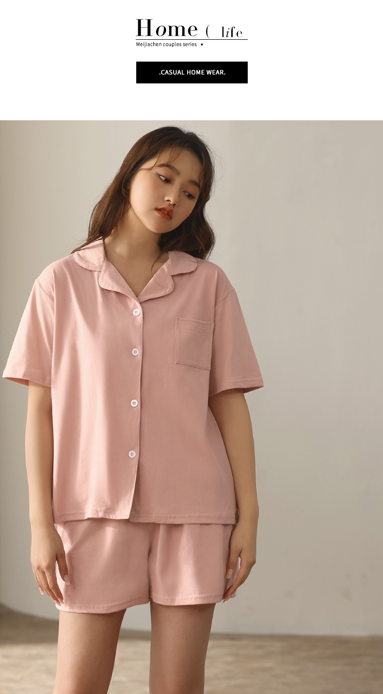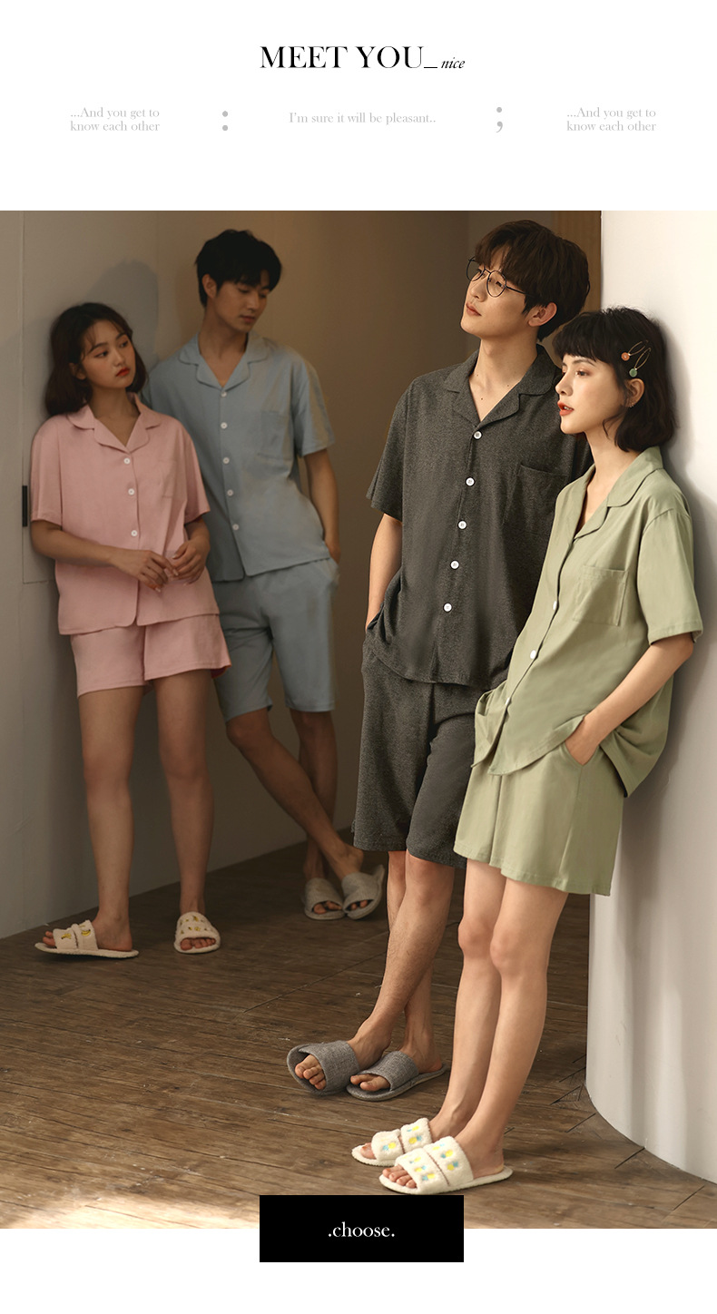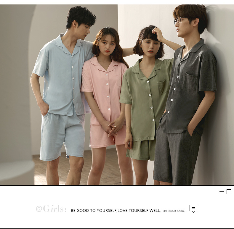 커플 잠옷 여자 여름 순면 얇은 반팔 반바지 봄과 여름 남자 단색 가디건 홈 의류 투피스 세트스토어 가기