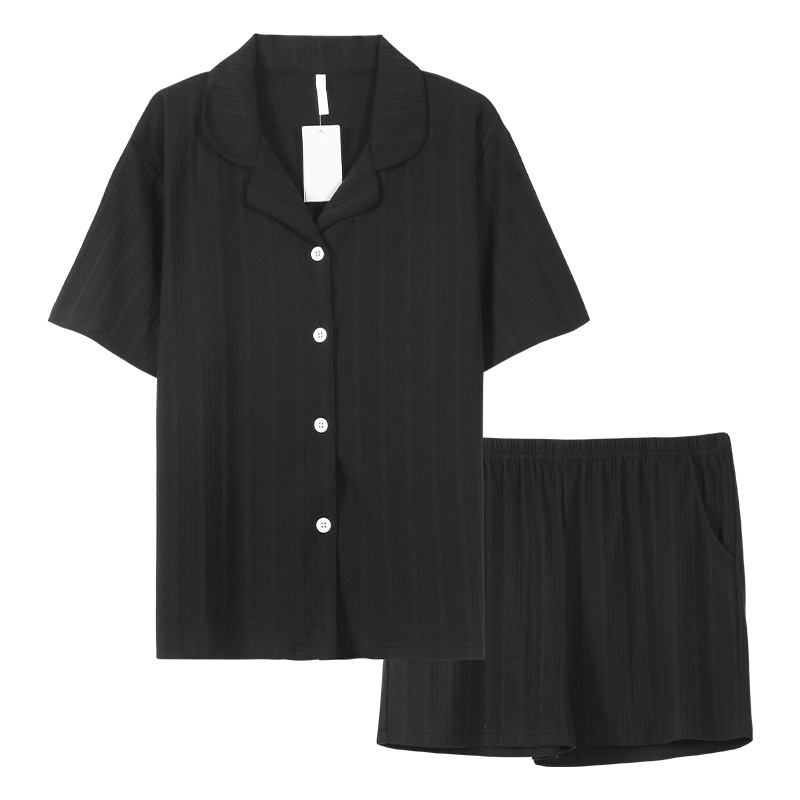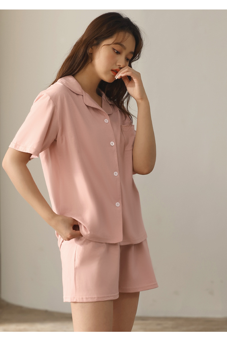커플 잠옷 여자 여름 순면 얇은 반팔 반바지 봄과 여름 남자 단색 가디건 홈 의류 투피스 세트