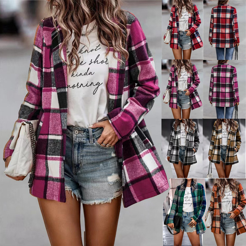 跨境欧美外贸女装2022秋冬新款亚马逊女士格子衬衣毛呢子排扣外套