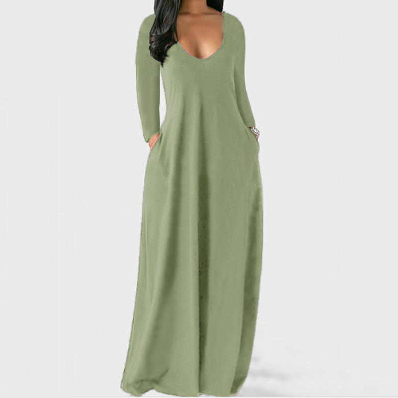 2023 유럽과 미국 여름 크로스 국경 대외 무역 새로운 플러스 사이즈 여성의 단색 원피스 섹시 깊은 V 긴 소매 원피스