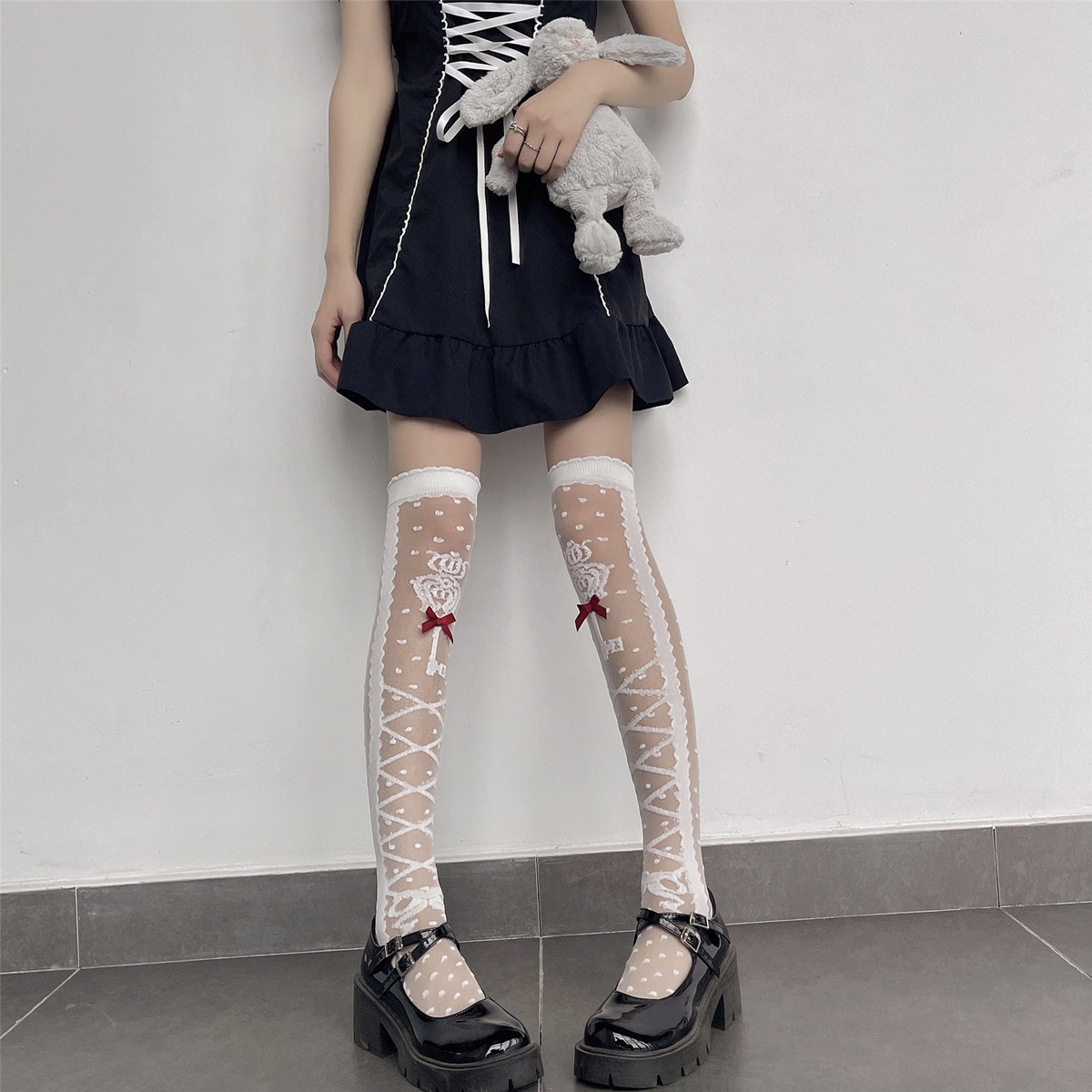 일본 JK 로리타 공주 부드러운 자매 화이트 크라운 수제 보우 스트랩 투명 자카드 무릎 높은 양말