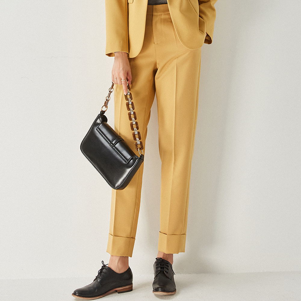 这款小脚裤区别于常规小脚裤的是,裤口做了翻折宽边,(注意:拍照样裤口翻折为7cm,大货裤口折边宽度是5cm哦!)小变化使得整体感觉更立体。上松下紧的锥形裤显瘦,是梨型身材的福音。利落干净的中缝线,立体显瘦,对腿型有很不错的修饰作用。
