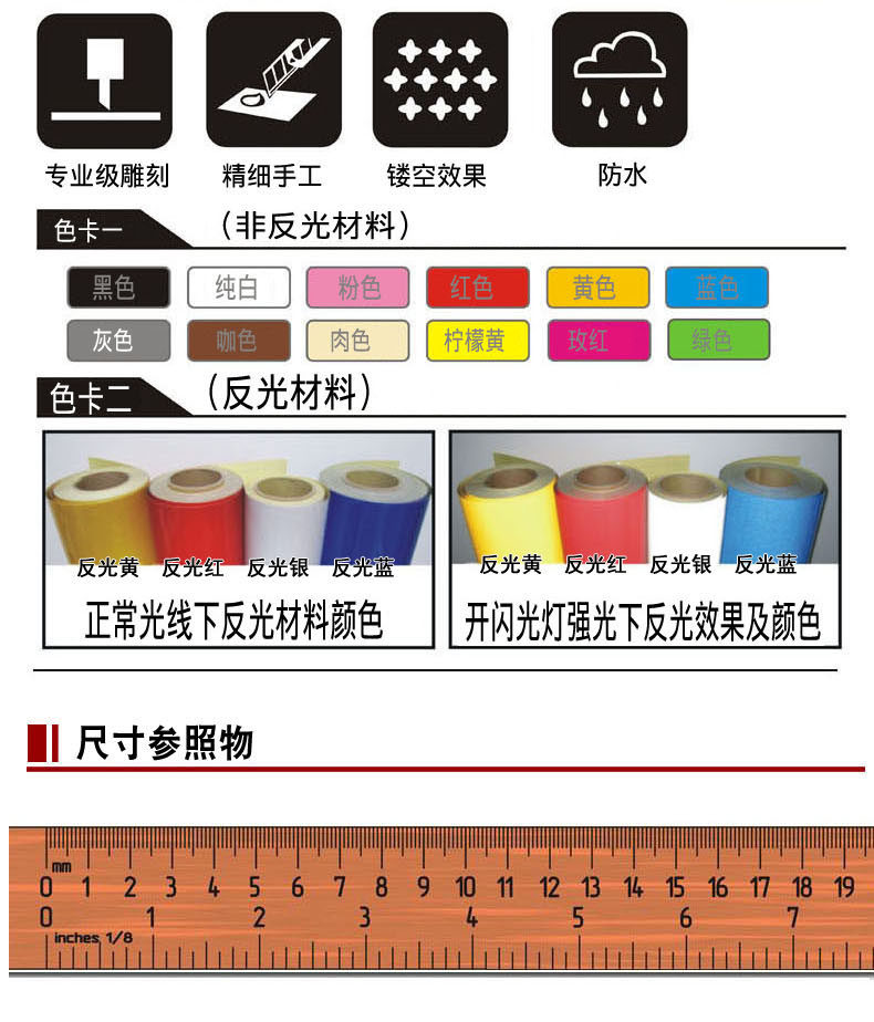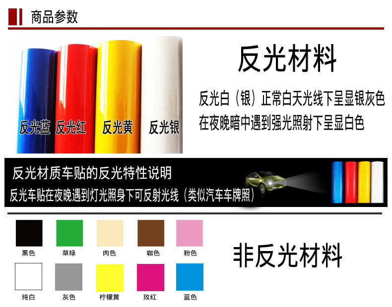 【材 料】国产不反光材料。汽车专用进口KK不反光材料。也有反光材质的贴纸。价格要偏高。如需要可以在旺旺咨询。