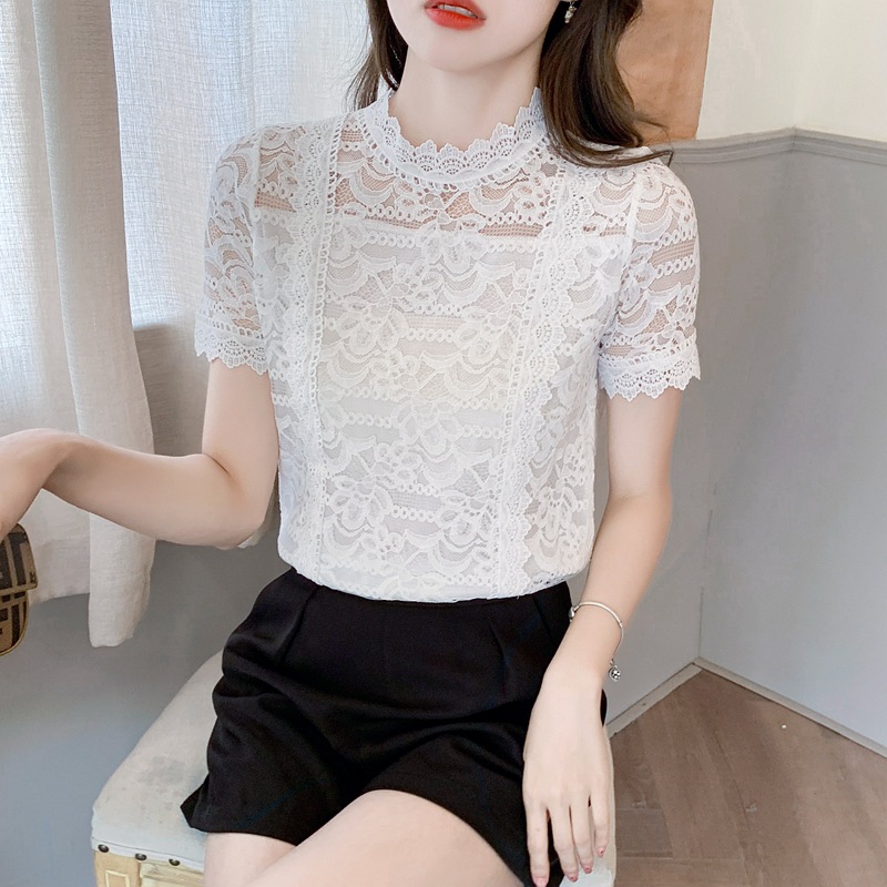 2021 여름 새로운 유행 우아한 단색 레이스 셔츠 여성의 세련된 반팔 쉬폰 셔츠 탑스토어 가기