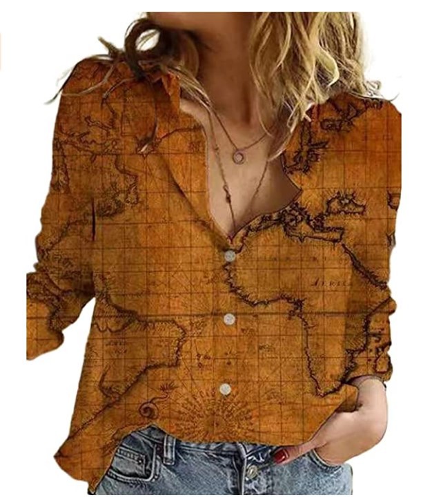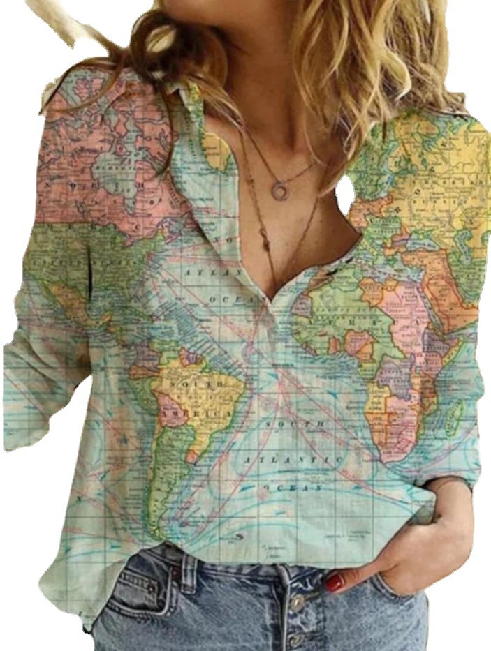 2021新款欧美独立站 亚马逊 地图描绘 印花长袖女装衬衣 大量现货
