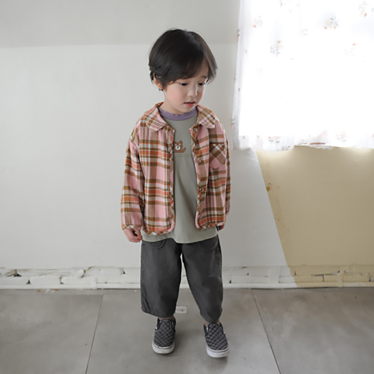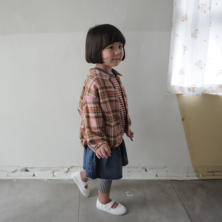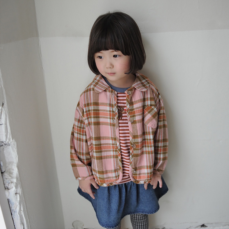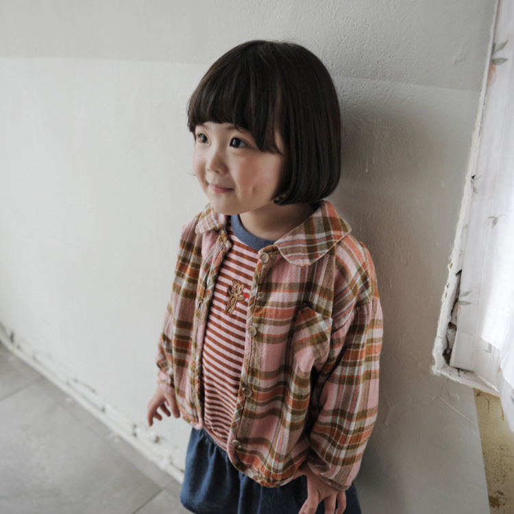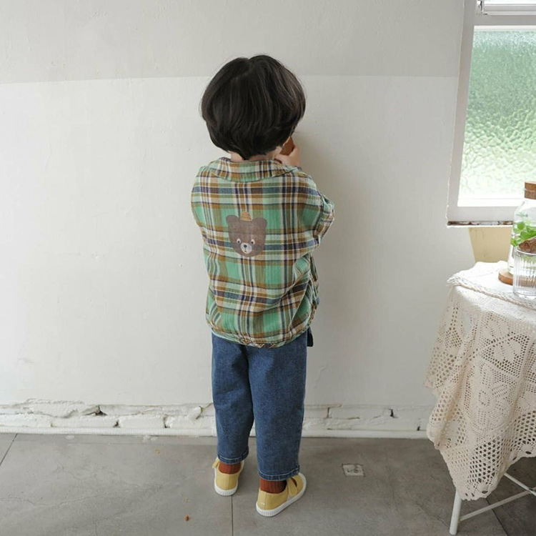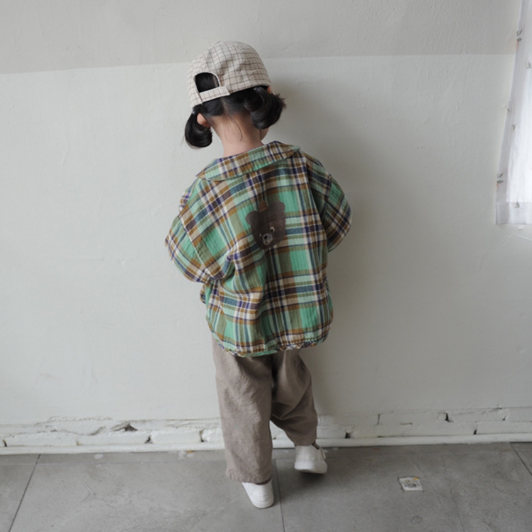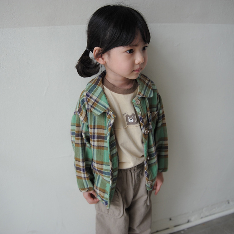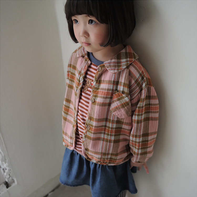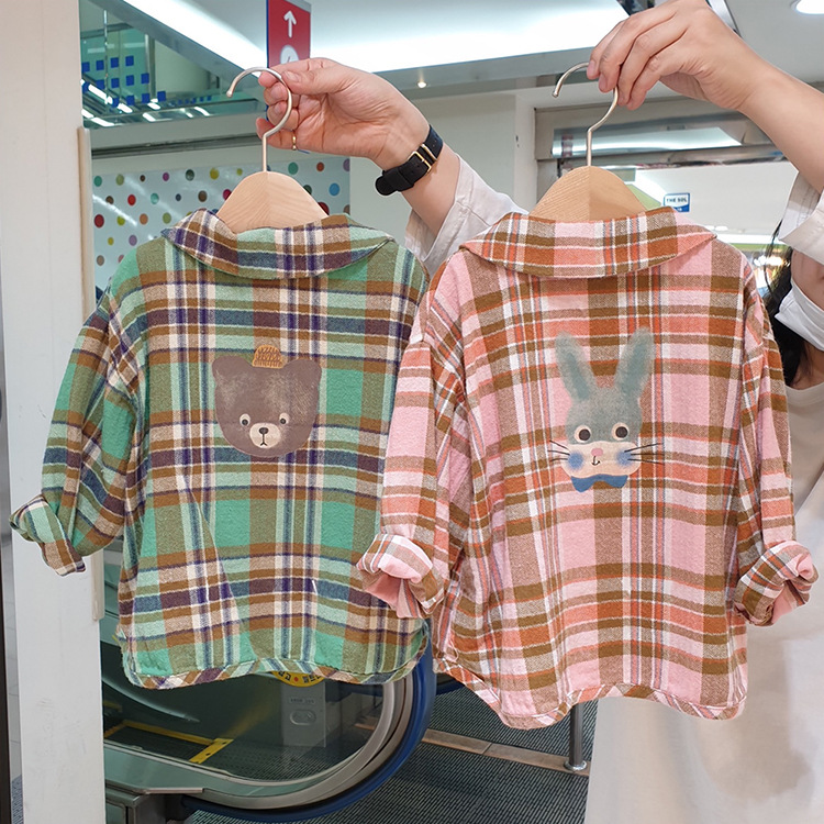 2024 가을 한국 스타일 아동복 신상 남아 여아 인형 프린트 캐주얼 체크 셔츠 아동용 긴팔 셔츠스토어 가기