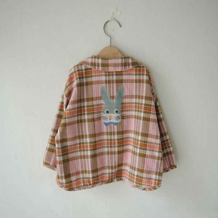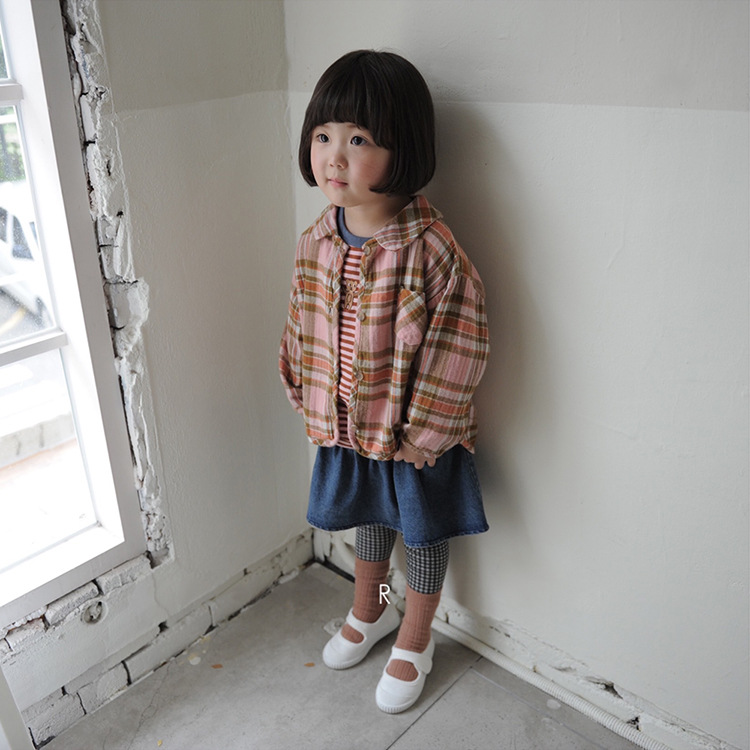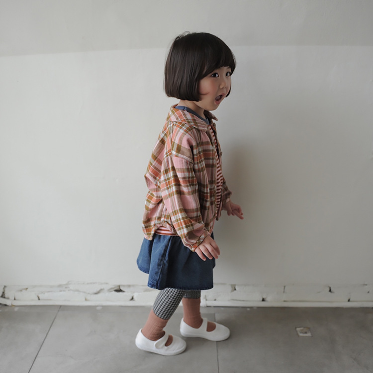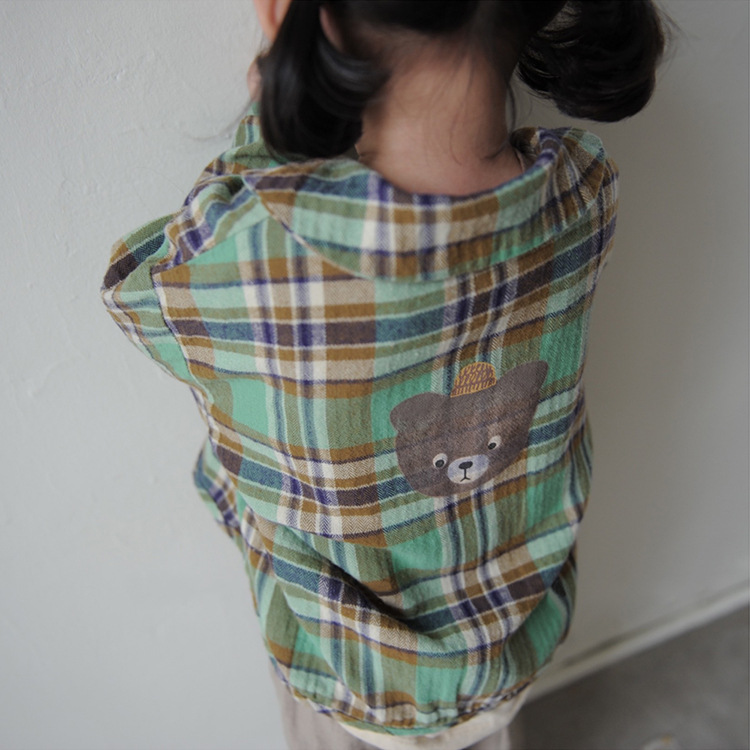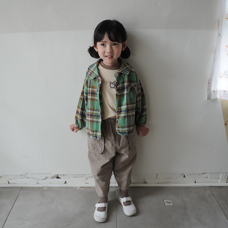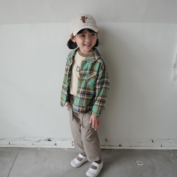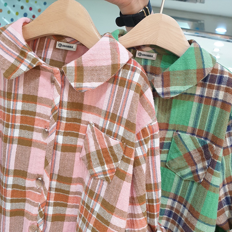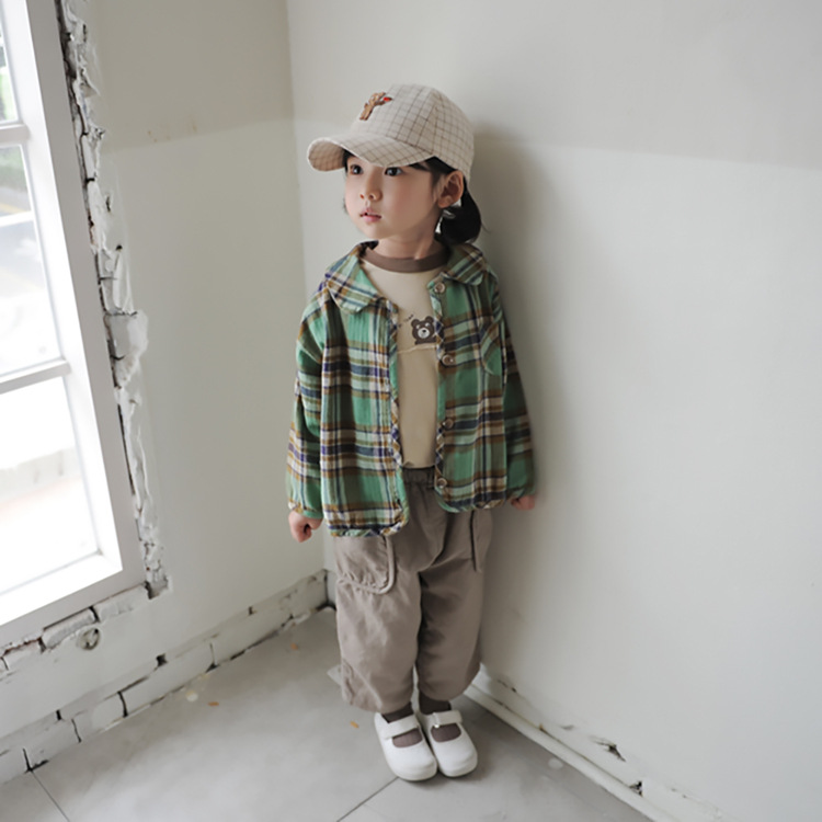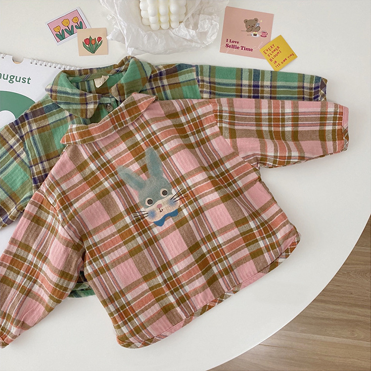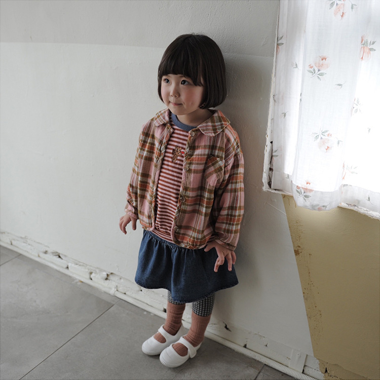 2024 가을 한국 스타일 아동복 신상 남아 여아 인형 프린트 캐주얼 체크 셔츠 아동용 긴팔 셔츠스토어 가기