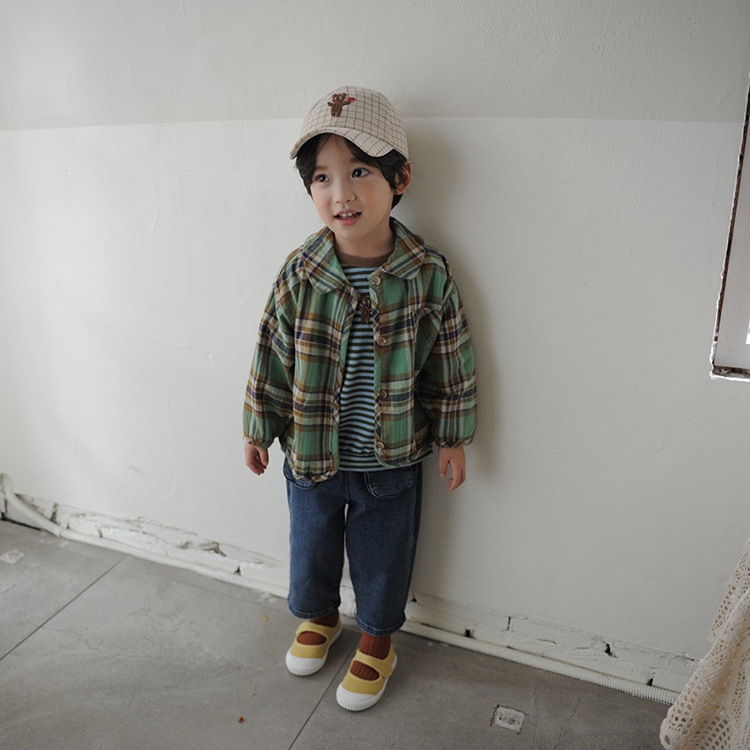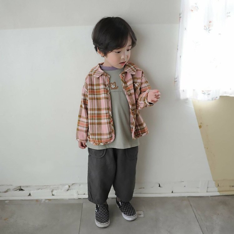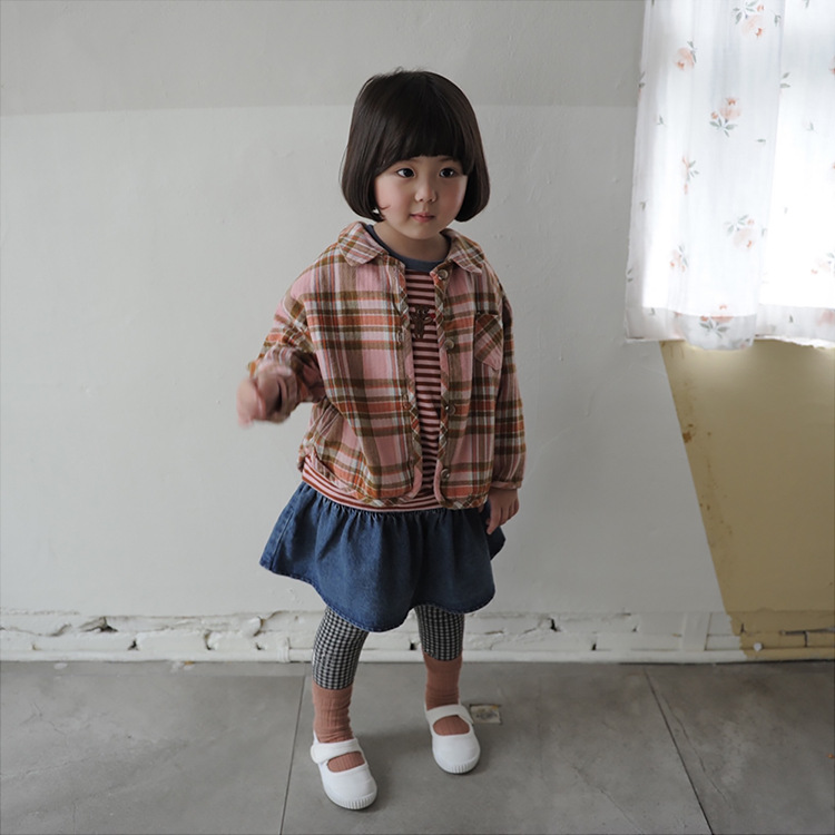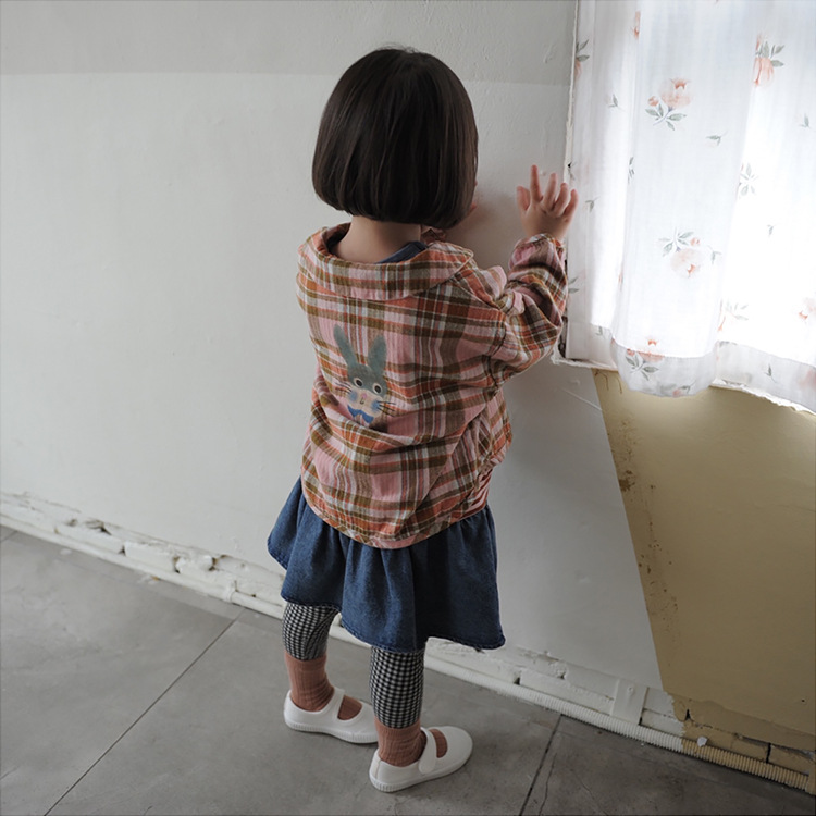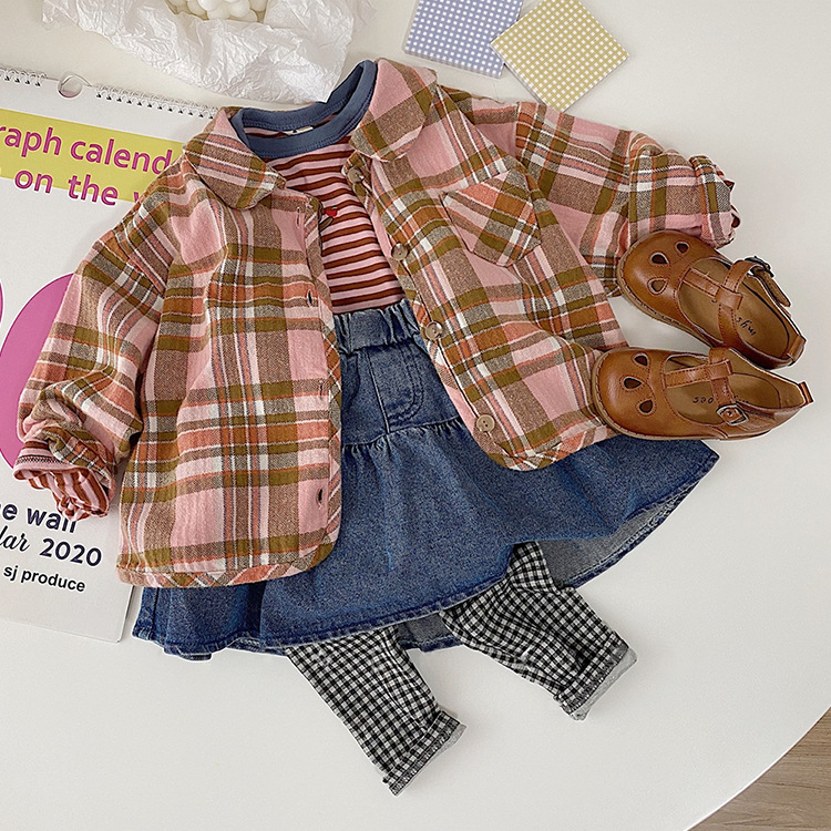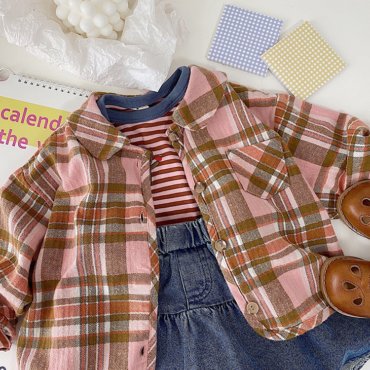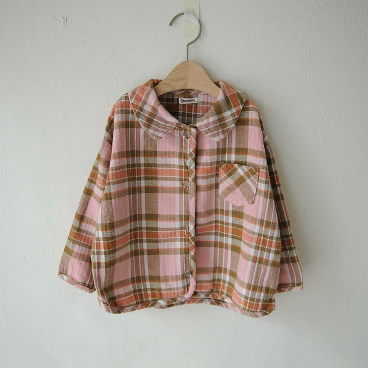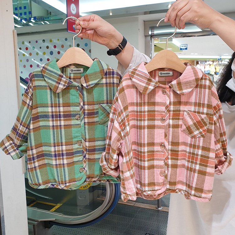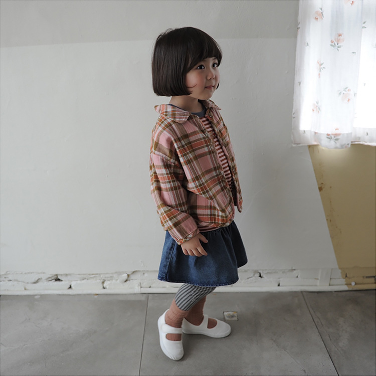 2024 가을 한국 스타일 아동복 신상 남아 여아 인형 프린트 캐주얼 체크 셔츠 아동용 긴팔 셔츠스토어 가기
