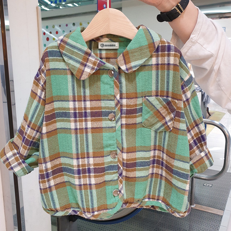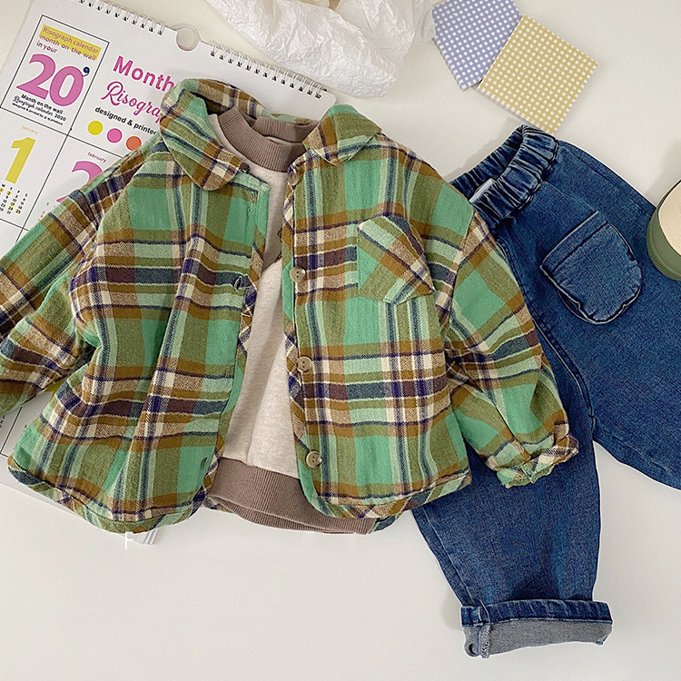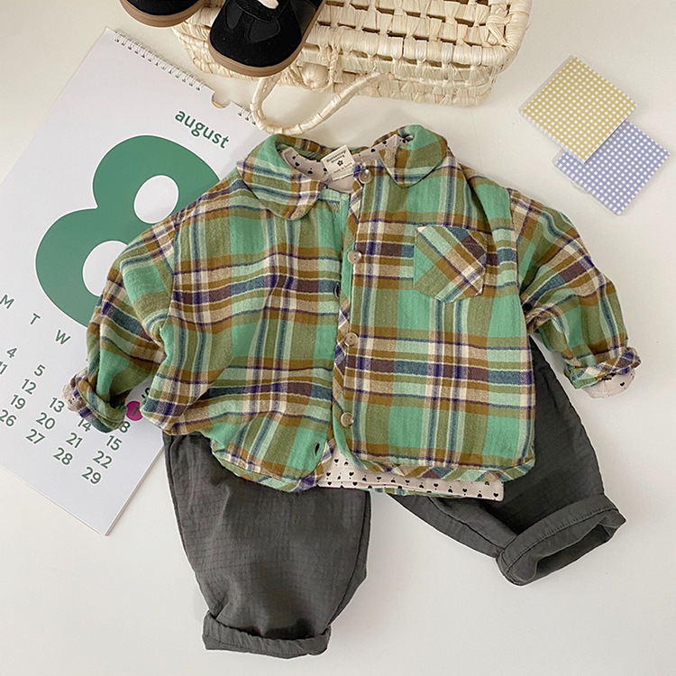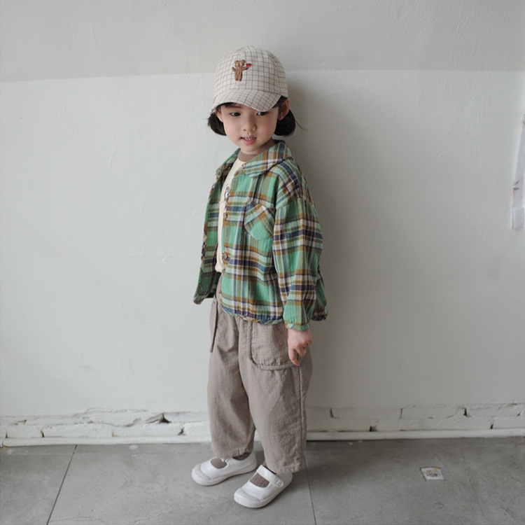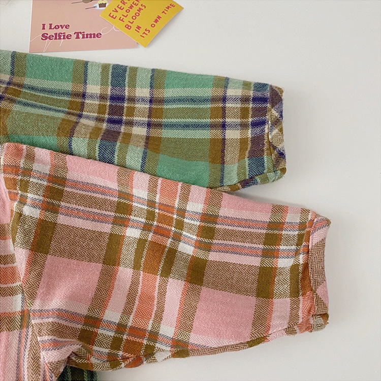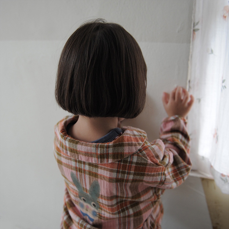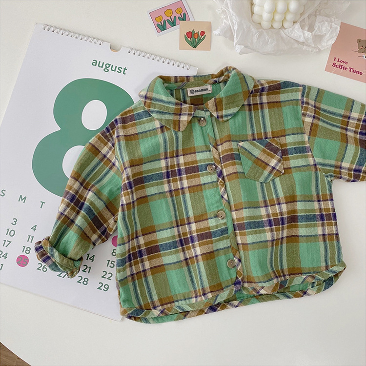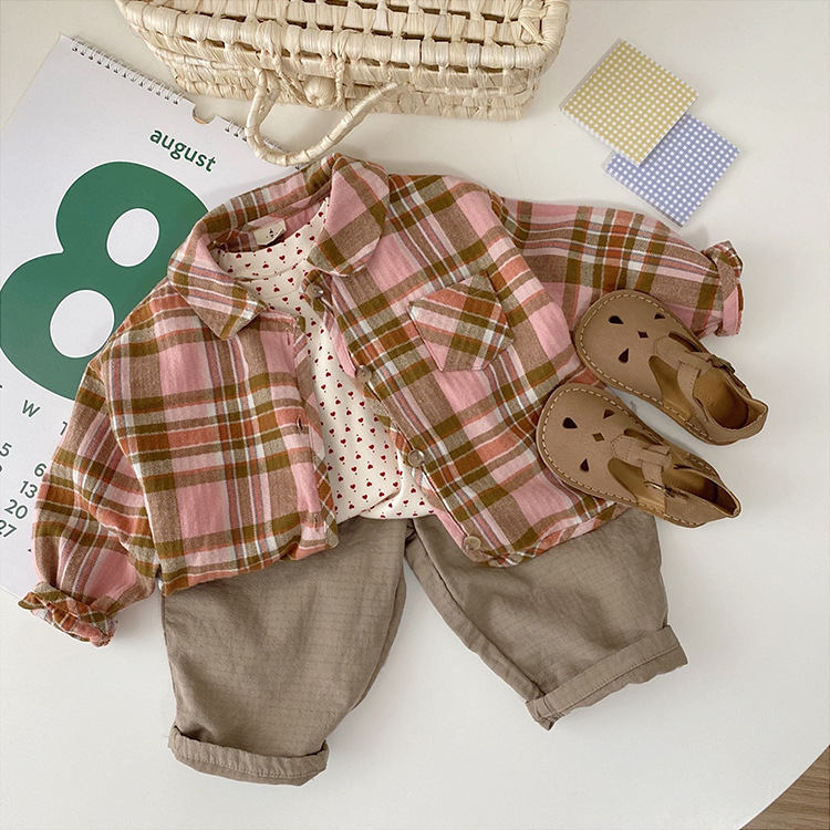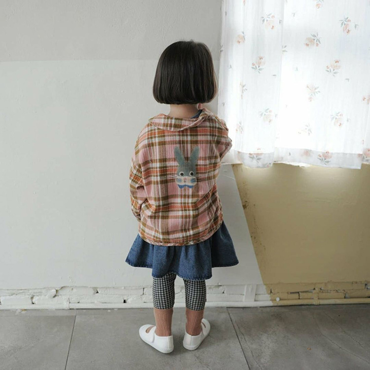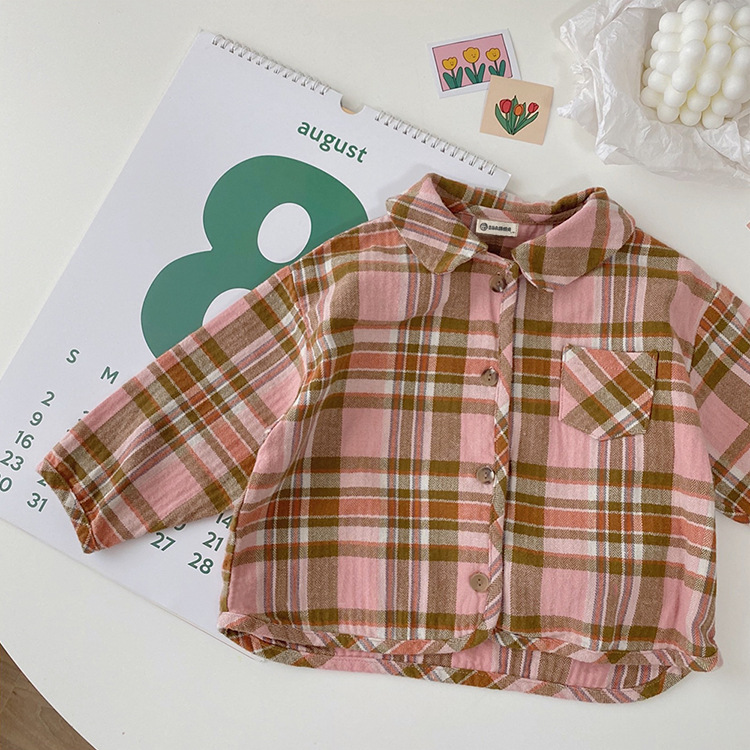 2024 가을 한국 스타일 아동복 신상 남아 여아 인형 프린트 캐주얼 체크 셔츠 아동용 긴팔 셔츠스토어 가기