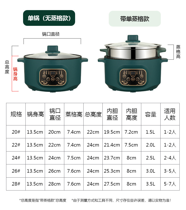 全规格覆盖:1.5L-3.5L 多容量(20#-28#),1-7 人全场景适配,单锅 / 带蒸格双款可选