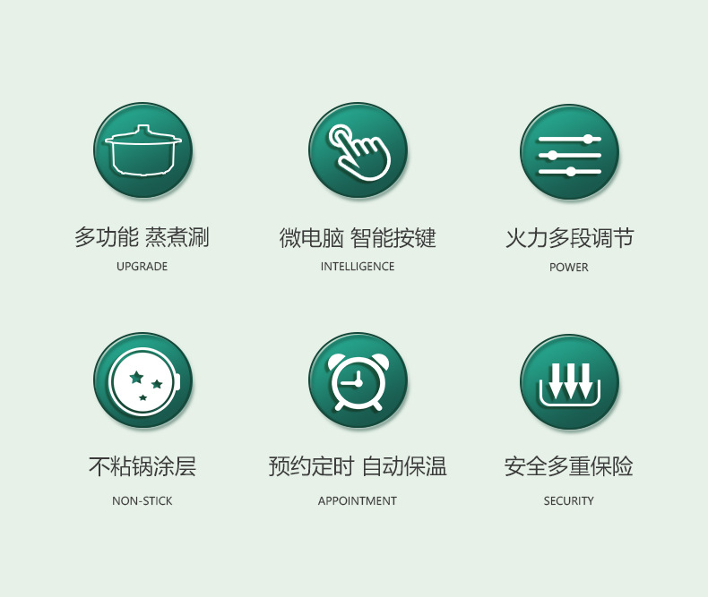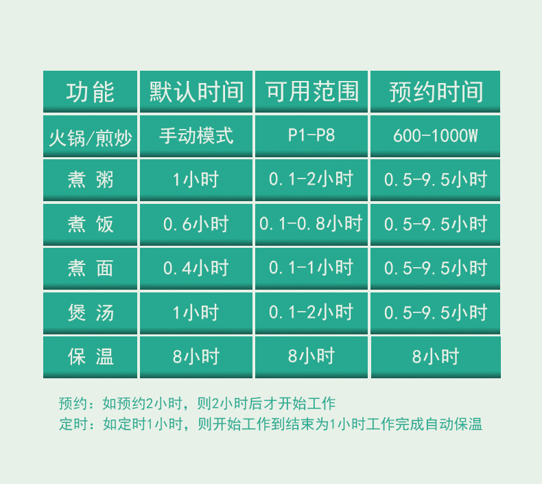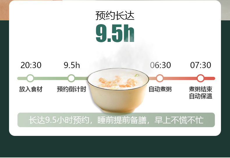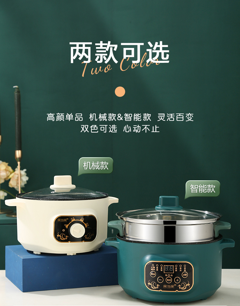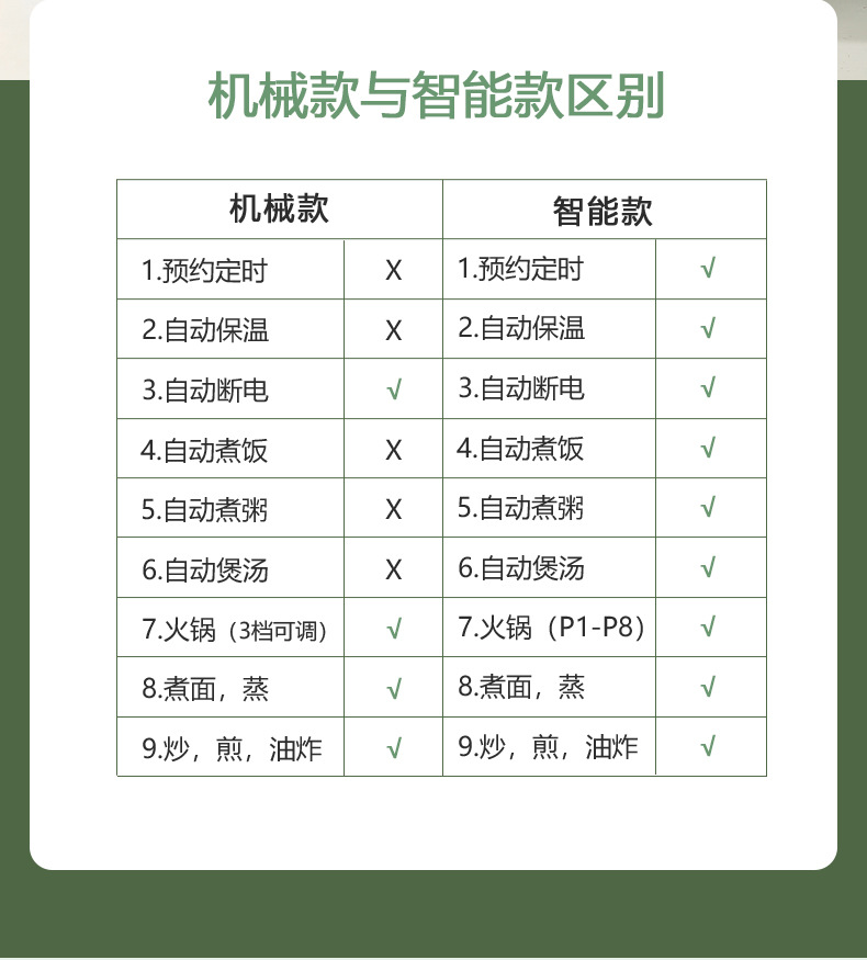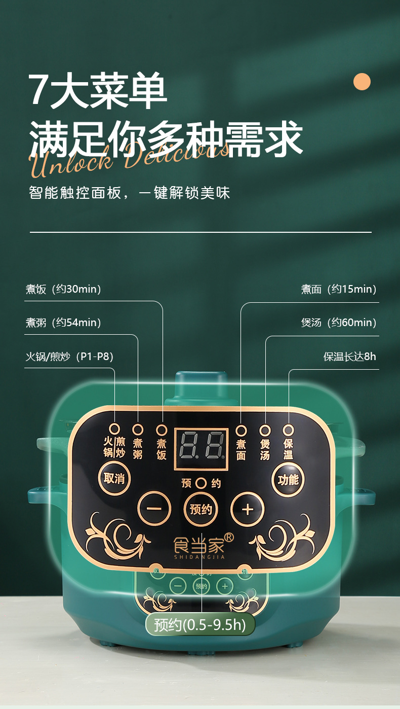 双控款型:智能触控款(7 大菜单 + 0.5-9.5h 预约 + 8h 保温)、机械旋钮款(400W/800W / 火锅三档)