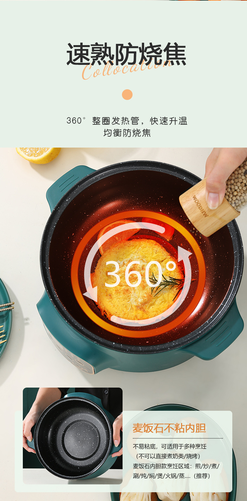 因为采用麦饭石不粘内胆 + 360° 整圈发热管,所以加热均匀不糊底,煎炒烹炸不粘底,一冲即净,清洁零负担;