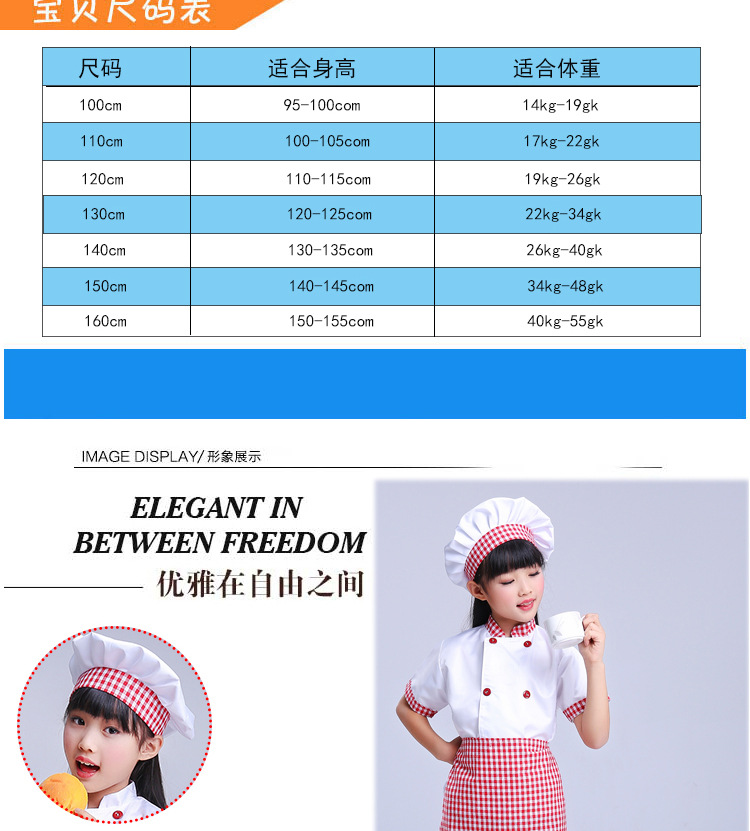 整套包括: 上衣 围裙,送帽子 哦 (以选项里面的图为准,图片中除了没有裤子 道具和鞋子,其余都有)尺寸 按照身高 身高多少选择多大 偏胖或者里面加衣服建议大一码或者两码或咨询客服尺码选择?一般身材根据身高选即可,比如:身高95--102cm选我们100尺寸的;身高103--112cm的选我们110尺寸的;身高113--122cm选我们120的;身高123--132cm选我们130尺寸的;身高133--142cm选我们140尺寸的;身高143--152cm选我们150尺寸的;依此类推,四舍五入。按照这个身高范围选择尺寸 偏胖或者加衣服穿 建议加大一码