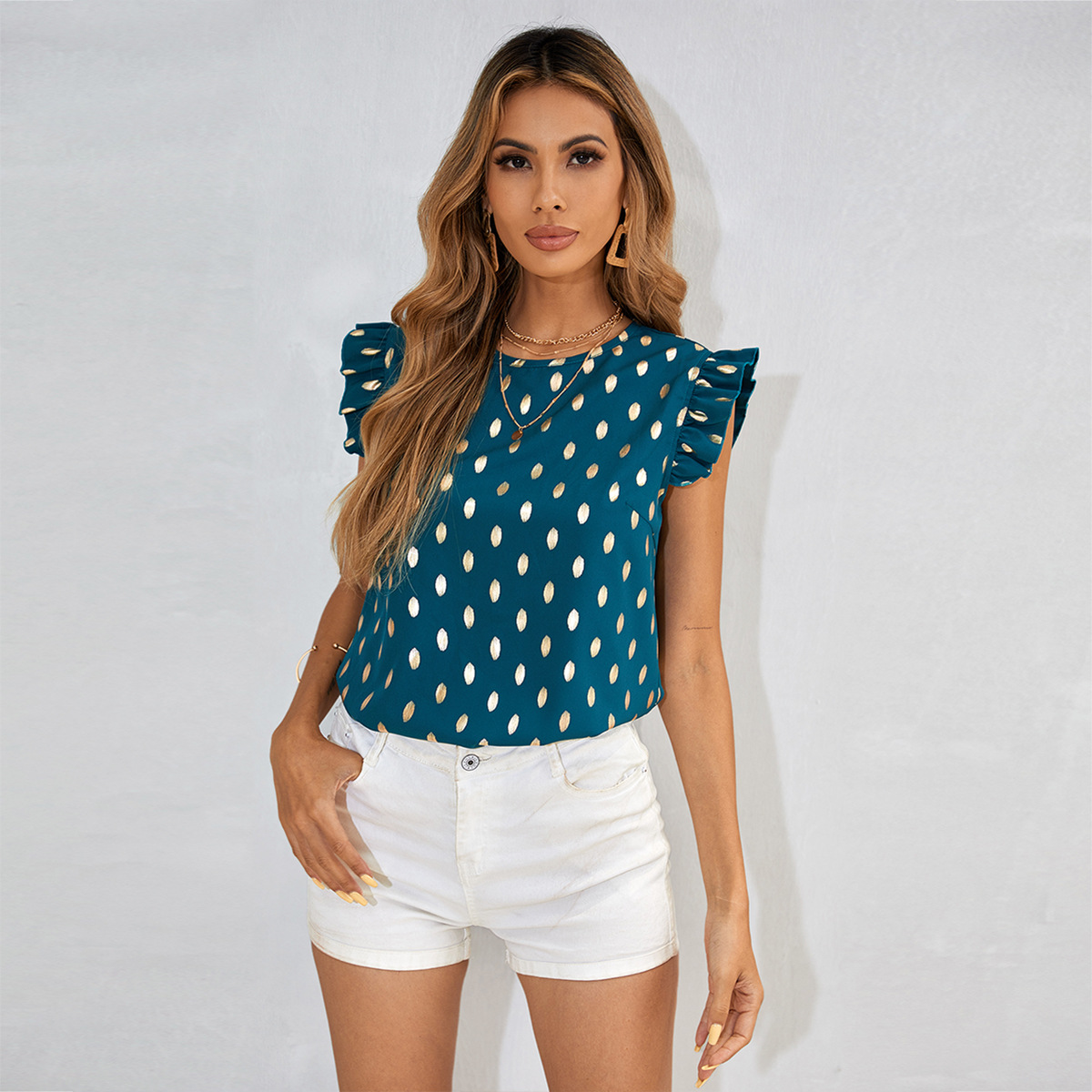 51190 # 아마존 유럽과 미국 2021 웨이브 도트 쉬폰 셔츠 여성의 새로운 반소매 웨스턴 스타일 패션 재킷