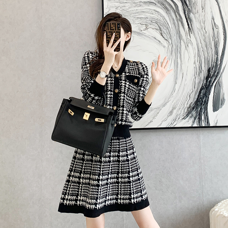 작은 샤넬 스타일 가을 새로운 니트 원피스 디자인 감각 튀긴 스트리트 스웨터 여성을위한 투피스 원피스 입고 작은 남자
