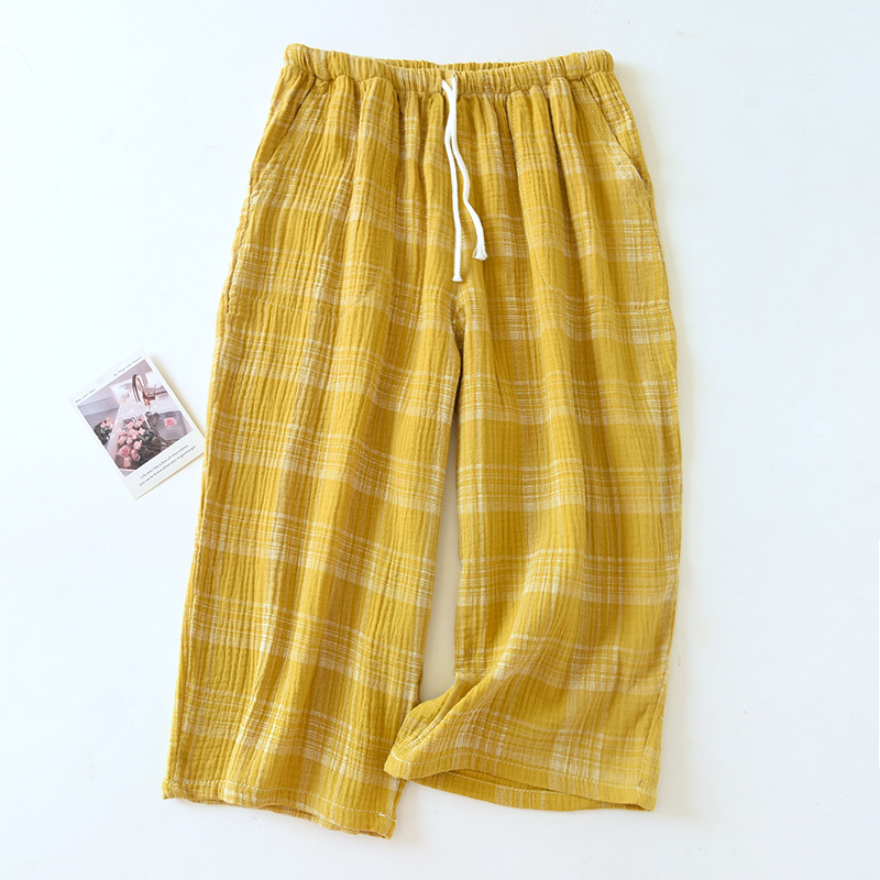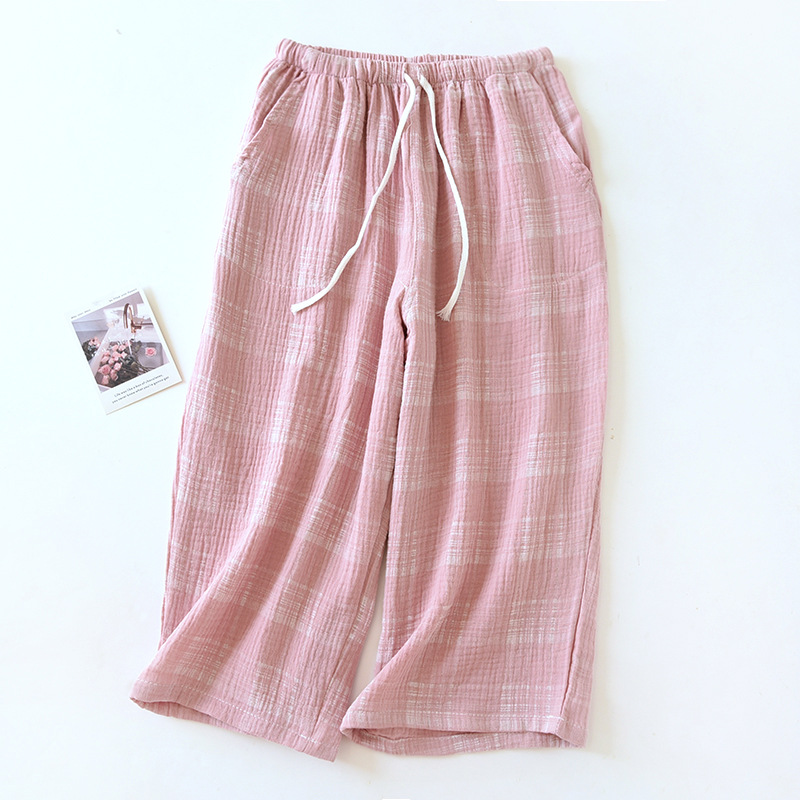 일본식 격자 무늬 순면 거즈 남성과 여성의 잠옷 바지 커플을위한 여름 얇은 면 크롭 바지 겉옷 홈 반바지