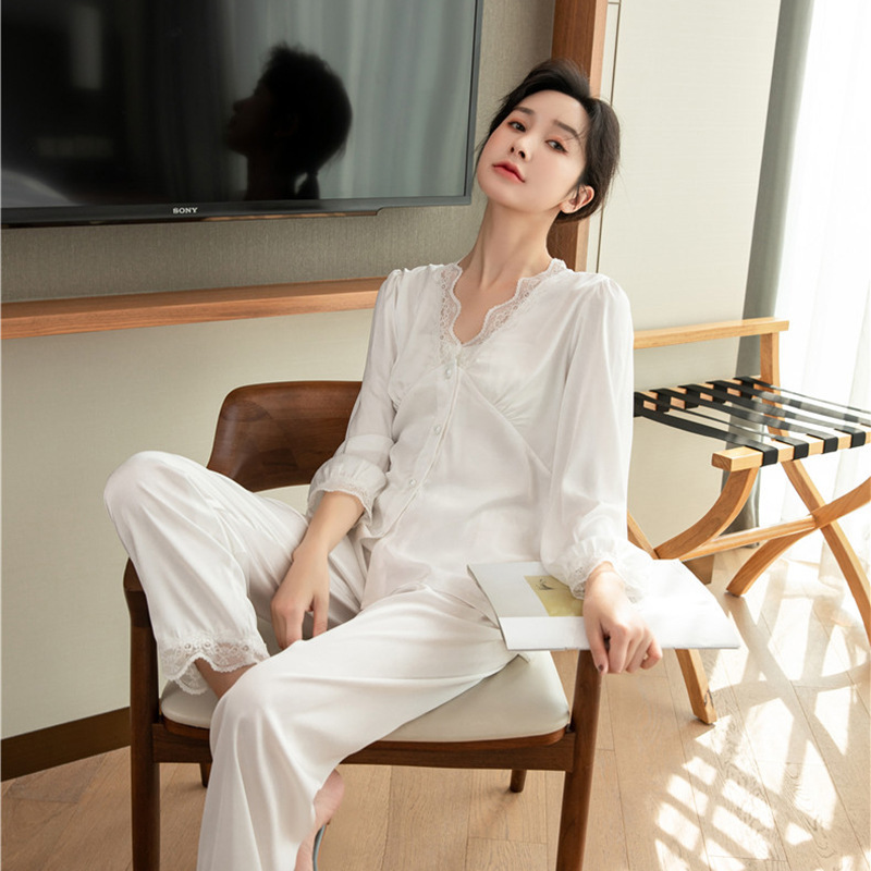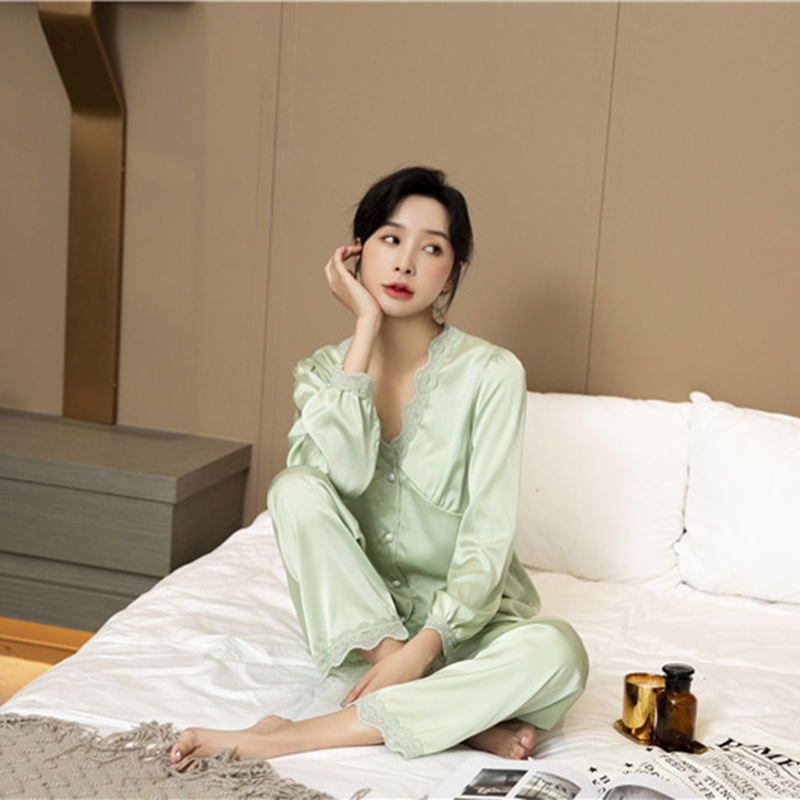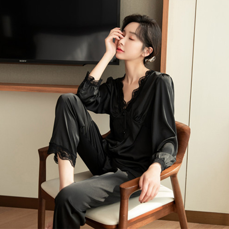 여름 얇은 섹시 레이스 아이스 실크 잠옷 긴팔 바지 한국 고급 단색 가정 옷 실크 세트스토어 가기