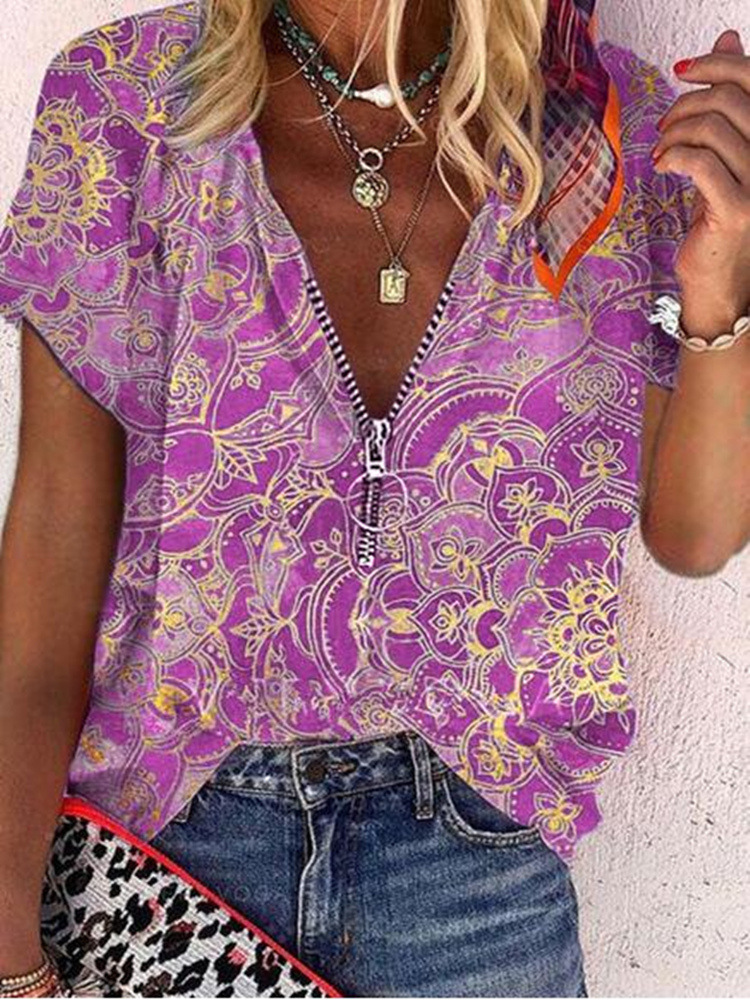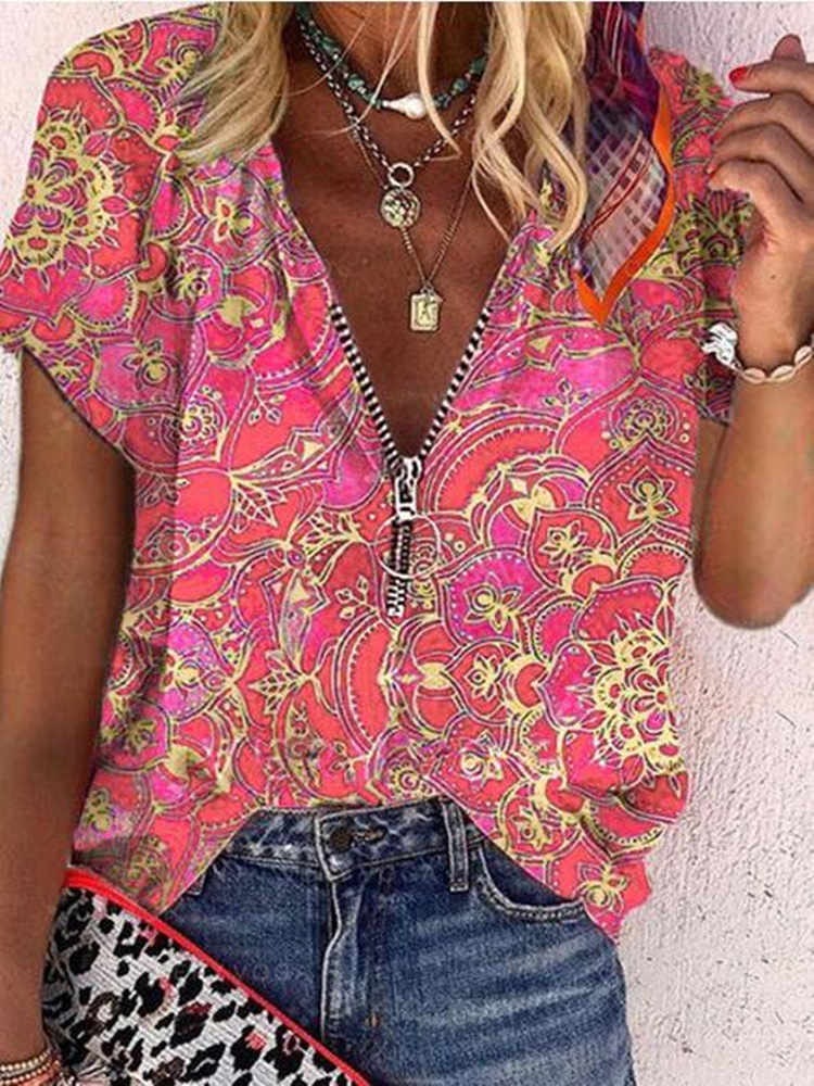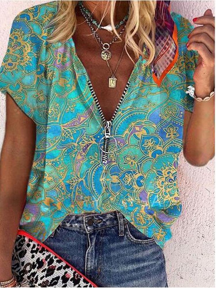 2021 독립 역 여름 여성 셔츠 유럽과 미국 인쇄 지퍼 느슨한 반팔 셔츠
