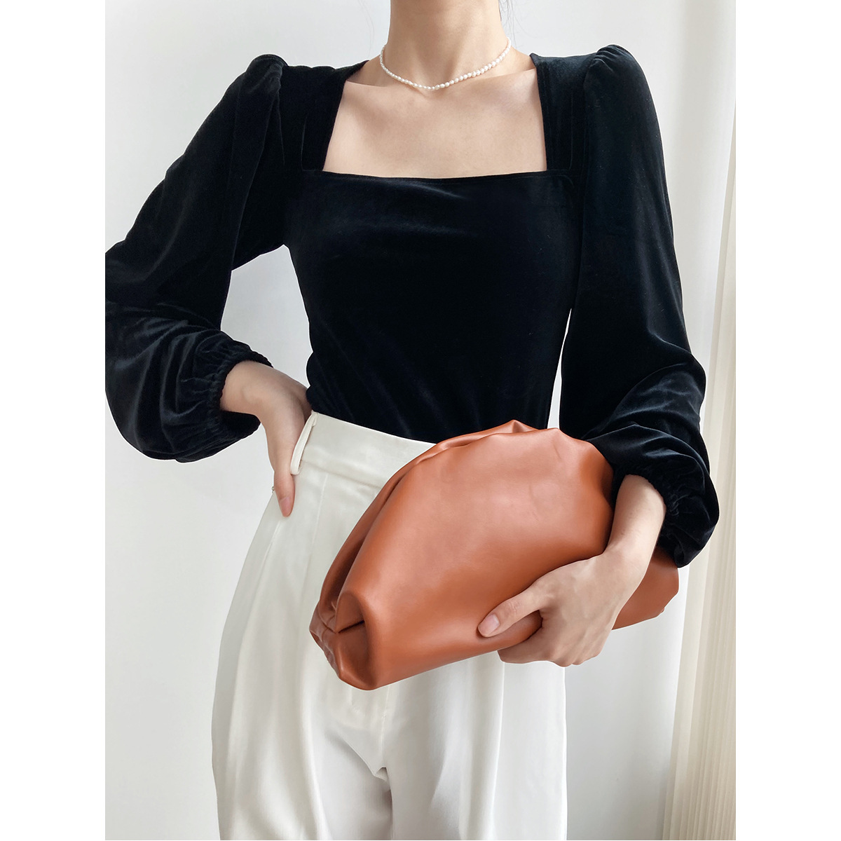 럭시 블랙 골든 벨벳 스퀘어 칼라 셔츠 여성의 가을 빛 성숙한 디자인 퍼프 슬리브 셔츠 쇄골 탑 921