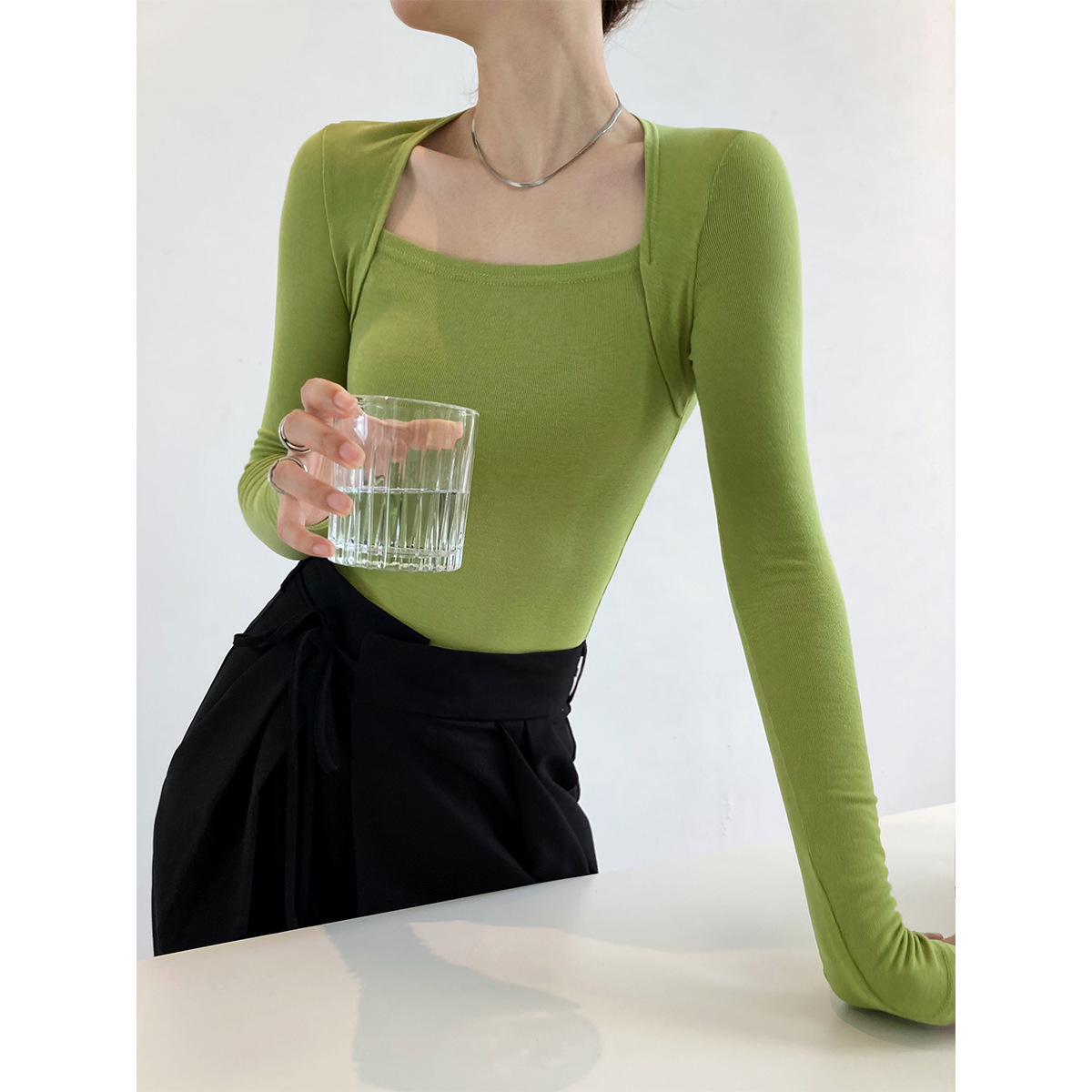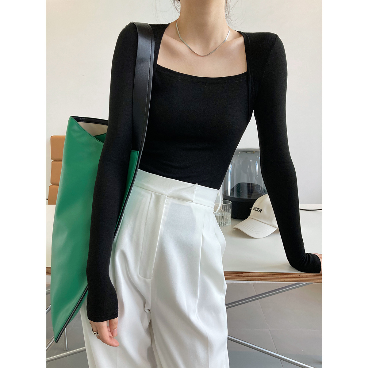 럭시 프렌치 퓨어 롱 슬리브 스퀘어 칼라 티셔츠 여성용 슬림핏 슬리밍 가짜 투피스 탑 가을 얇은 베이스 셔츠 283스토어 가기