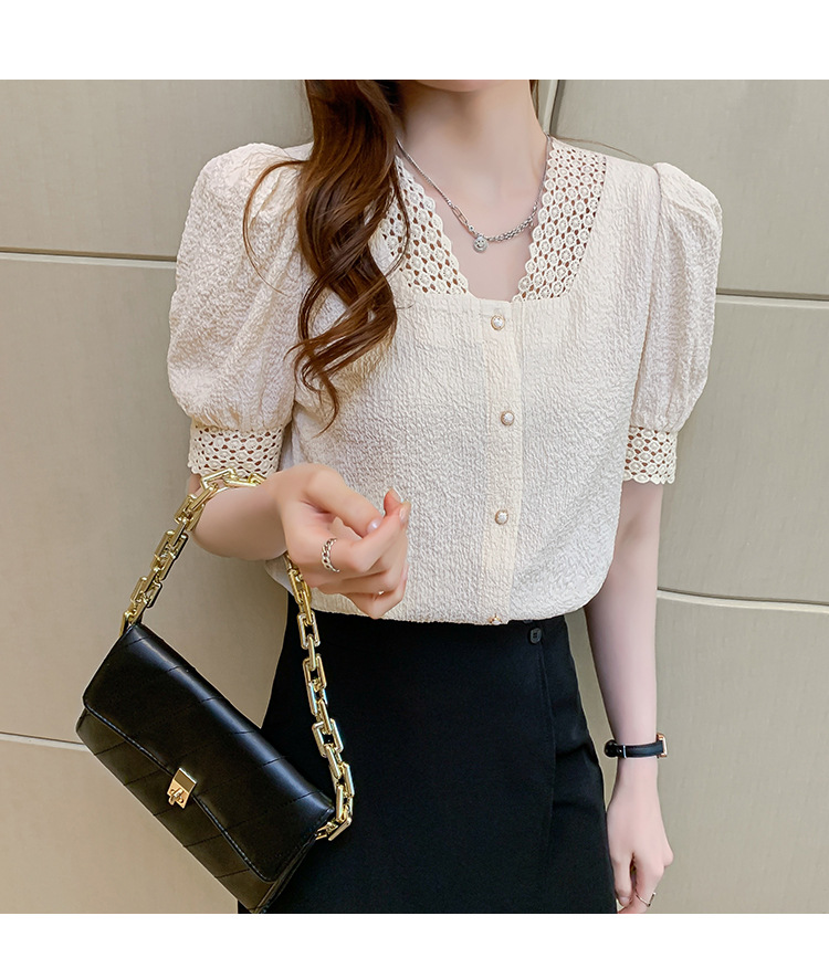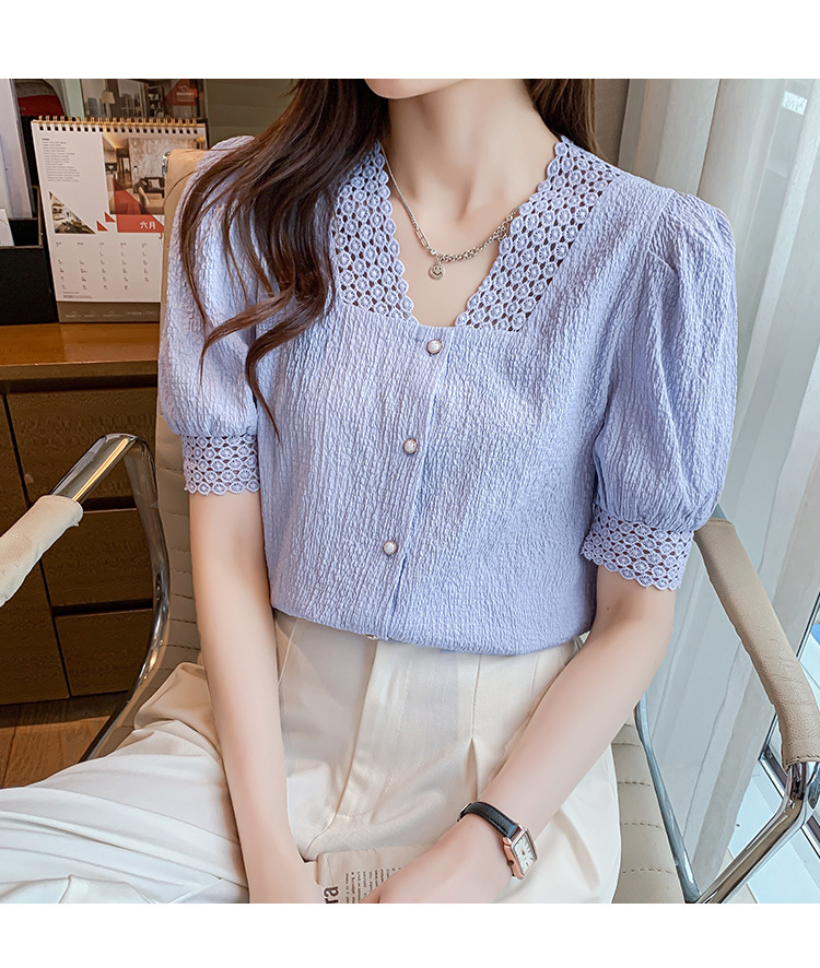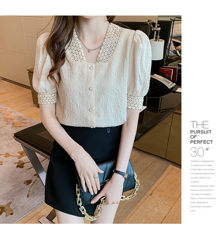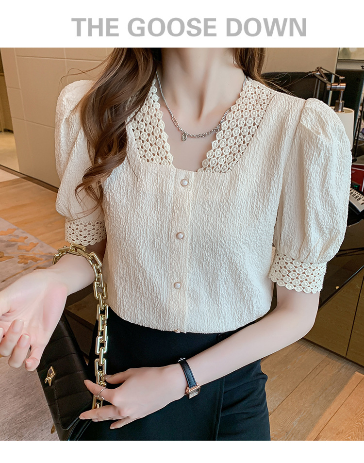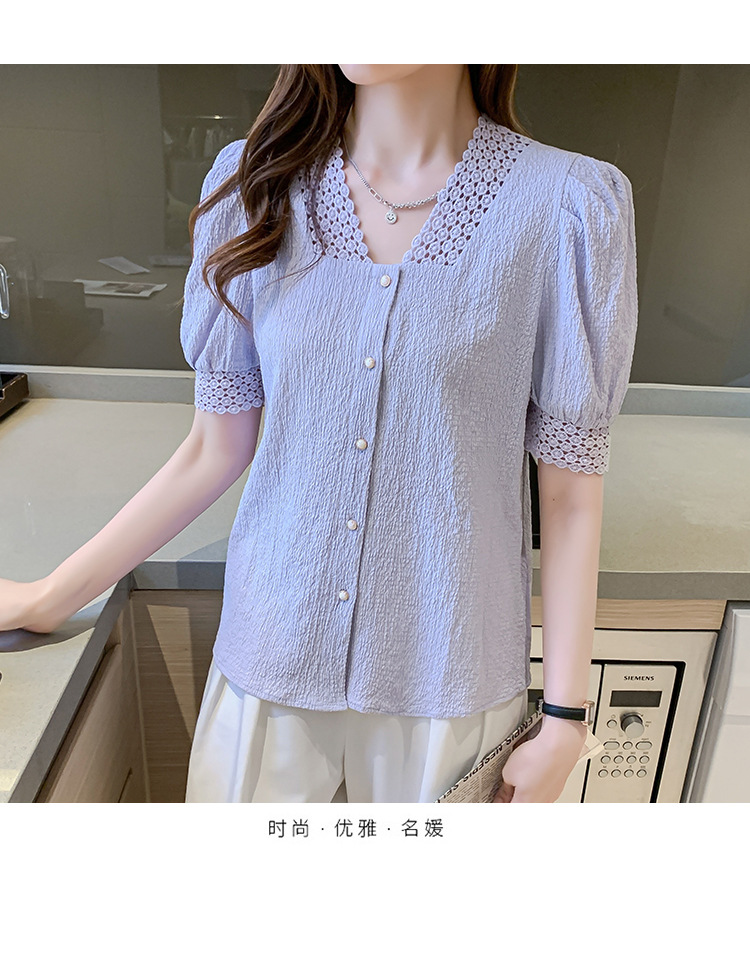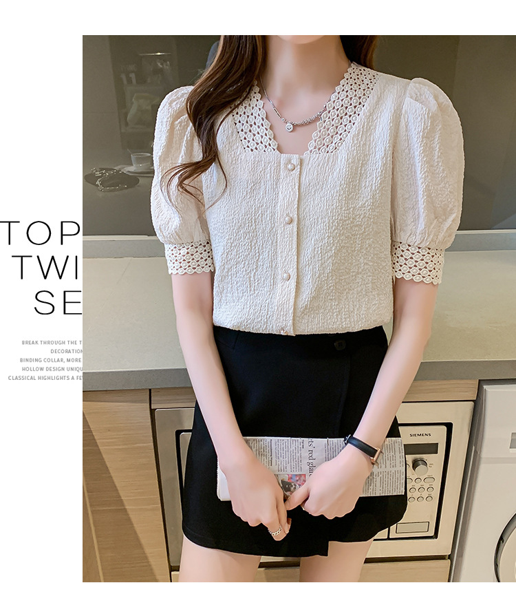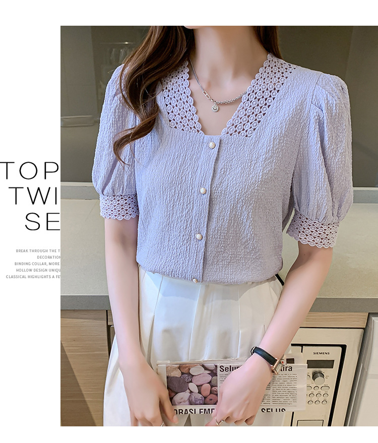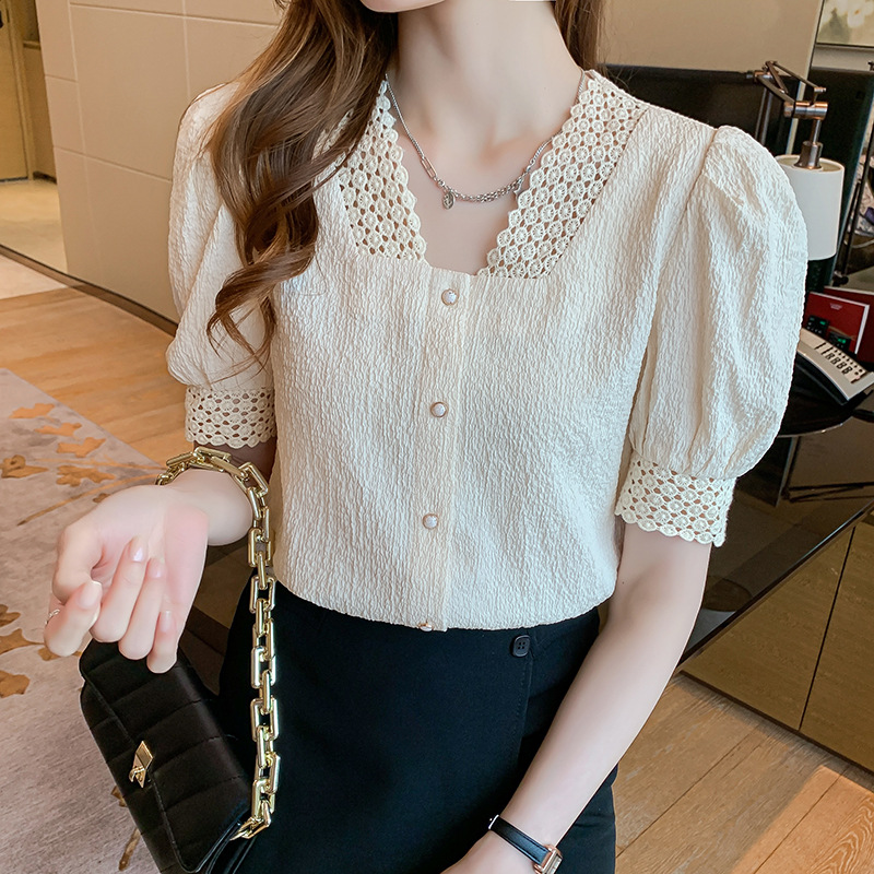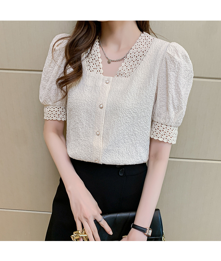 2026년 여름 신상 디자인 감각적인 니치 스타일 V넥 싱글 버튼 주름 퍼프 소매 짧은 레이스 블라우스 여성용스토어 가기
